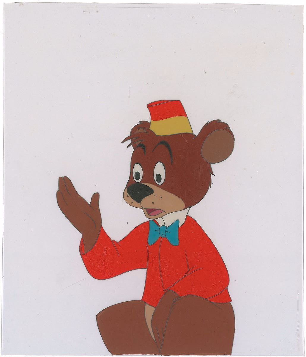 (Walt Disney Studios, 1947) Original production cel featuring Bongo Bear from Fun and Fancy Free, showing him in a red coat and bow tie. The cel is trimmed to 6.5 x 7.75. Image measures 4 x 5.5. In fine condition.