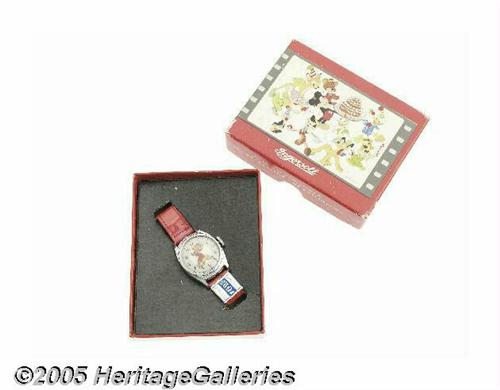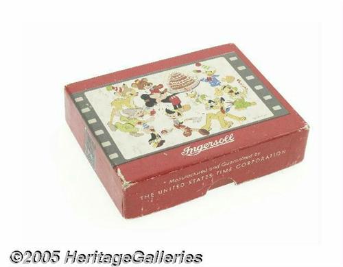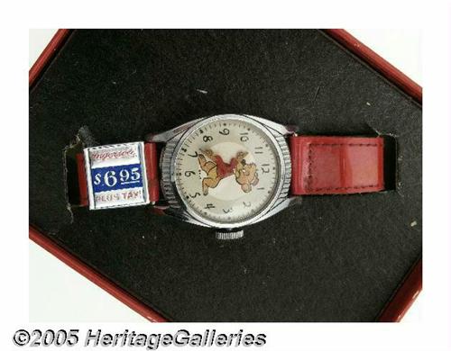 <B>Bongo Wrist Watch with Box (Ingersoll, 1949).</B></I> Never considered to be a major character by many Disney collectors, any collectible items featuring Bongo the bear are tough ones to find. Offered here is a gorgeous Bongo watch from the Ingersoll "Birthday Series" of 1949. The watch has apparently never been removed from its original box and shows absolutely no wear, and the original $6.95 price sticker remains intact. The colorful box is also complete and shows only light wear, primarily to edges and corners. It's so nice we can "bearly" stand it! <I>From the Larry Jacobs Collection.</B></I>