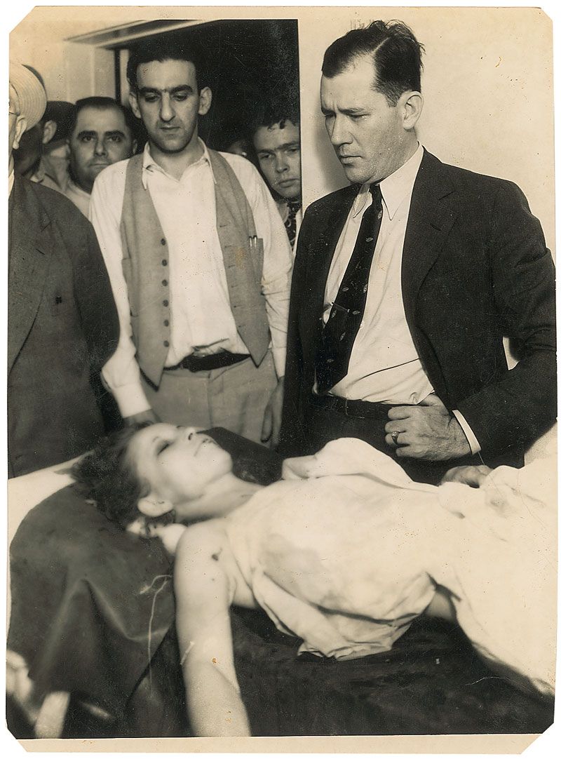 Original vintage first generation 7.25 x 10 semi-glossy photo of Bonnie Parker at the undertaker’s with a throng of onlookers standing in the room. In fine condition, with clipped corner tips and slightly trimmed vertical edges.