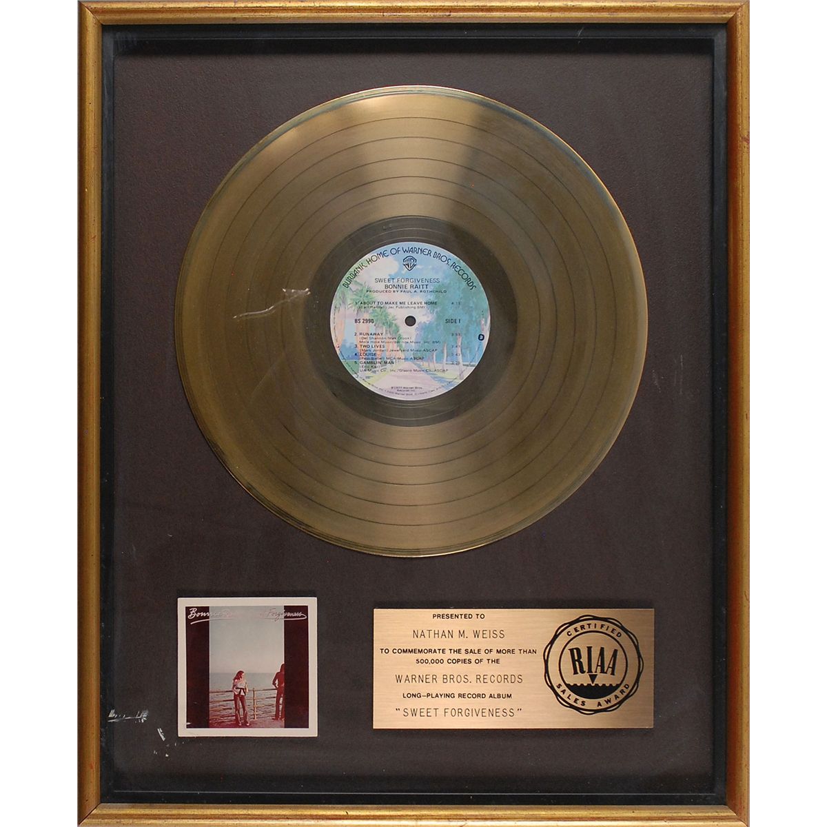 RIAA floater-style gold record sales award presented to Nathan M. Weiss, “to commemorate the sale of more than 500,000 copies of the…long-playing record album ‘Sweet Forgiveness.’” Disc is in its original gold-painted frame with its plaque and color reproduction album art, and retains its original backing and Creative Glassics label affixed to the bottom edge. In fine condition. Award originates from the estate of renowned music and entertainment attorney Nathan Weiss.
