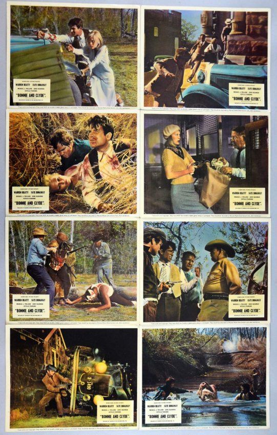 Bonnie and Clyde (1967) UK front of house set of 8 cards, starring Warren Beatty & Faye Dunaway, Warner Bros., A- (8) 8 x 10in. (20 x 25cm)