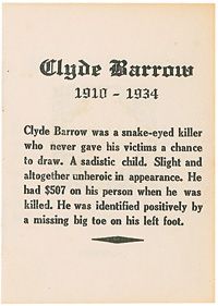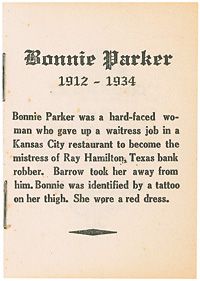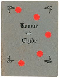 Limited edition miniature book entitled Bonnie and Clyde, 2.25 x 3, 10 pages, approximately 100 copies, printed in 1968 by Frank J. Anderson “for the friends of the Wofford Librarian.” Book gives brief assessments of the life of Bonnie and Clyde and concludes with “Bonnie and Clyde were about as lovable as Ilse Koch and Martin Bormann.” In fine condition.