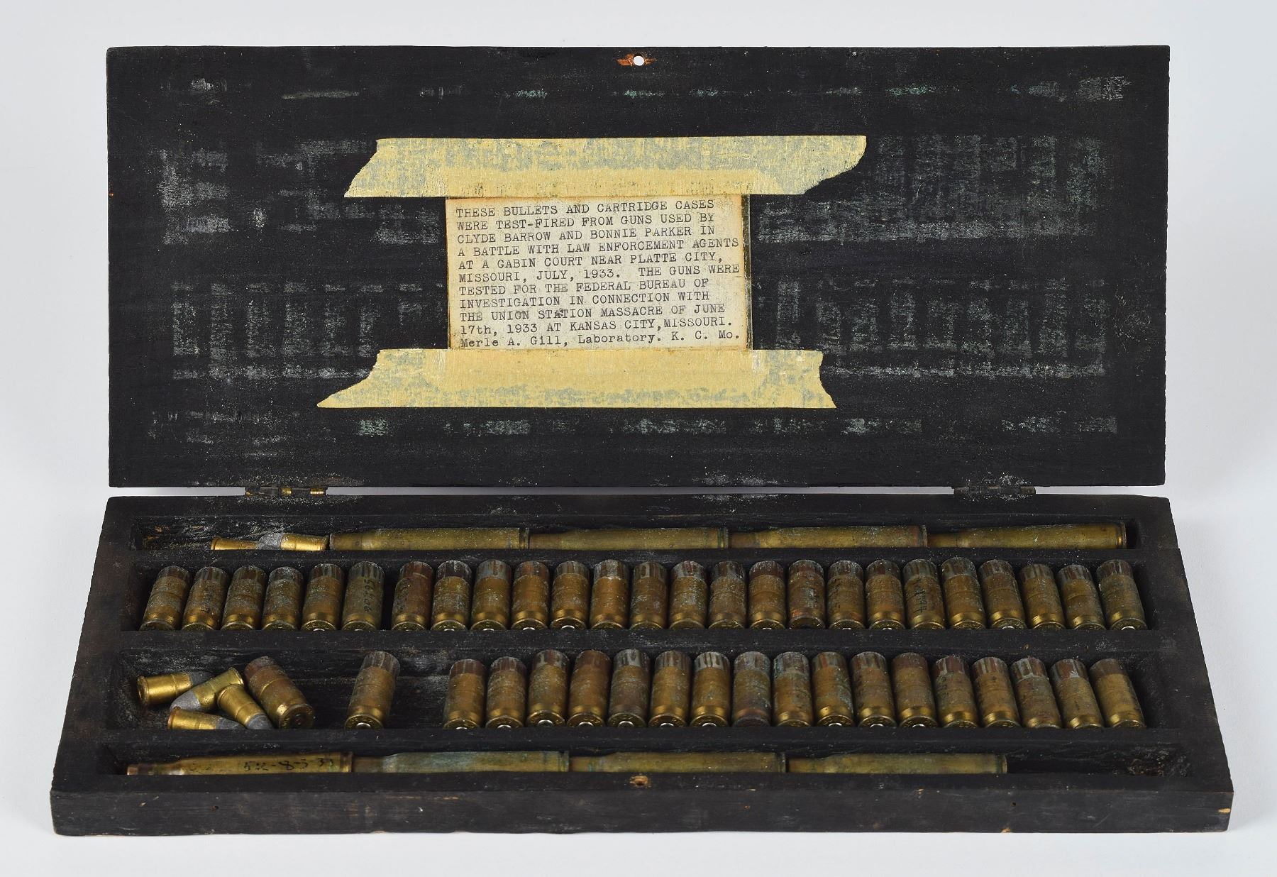 Test cartridges fired by forensic ballistician Merle A. Gill used in the Union Station Massacre and Red Crown Tavern shootout investigations of 1933. This is a small, hand-made wooden case (1 3/8? x 13 1/2? x 5 1/2?) that has four internal trays containing 63 handgun and rifle cartridges, most of which have been fired, and their recovered bullets placed backwards into the case so that the rifling patterns are visible. Most of the cartridges are .45 ACP, and all are numbered (over 40 Model 1911 pistols were taken from the gang's cabin at the Red Crown). Also present are a number of fired .30-06 cases (unfortunately the notes painted onto them have faded to illegibility, however they were probably fired from the captured BARs taken at the Red Crown), and six unfired rounds of .32 S&W. A typed note affixed inside the case’s lid reads, in part: “These bullets and cartridge cases were test-fired from guns used by Clyde Barrow and Bonnie Parker in a battle with law enforcement agents…near Platte City, Missouri, July, 1933. The guns were tested for the Federal Bureau of Investigation in connection with the Union Station massacre of June 17th, 1933 at Kansas City, Missouri. Merle A. Gill, Laboratory, K.C. Mo.” The case's hinged lid is crudely secured with a screw.