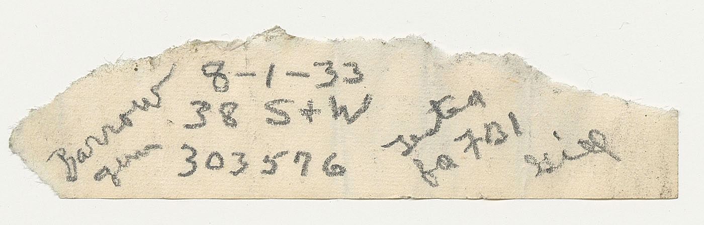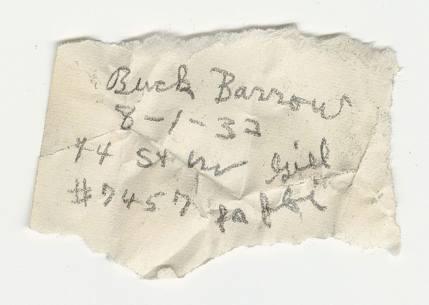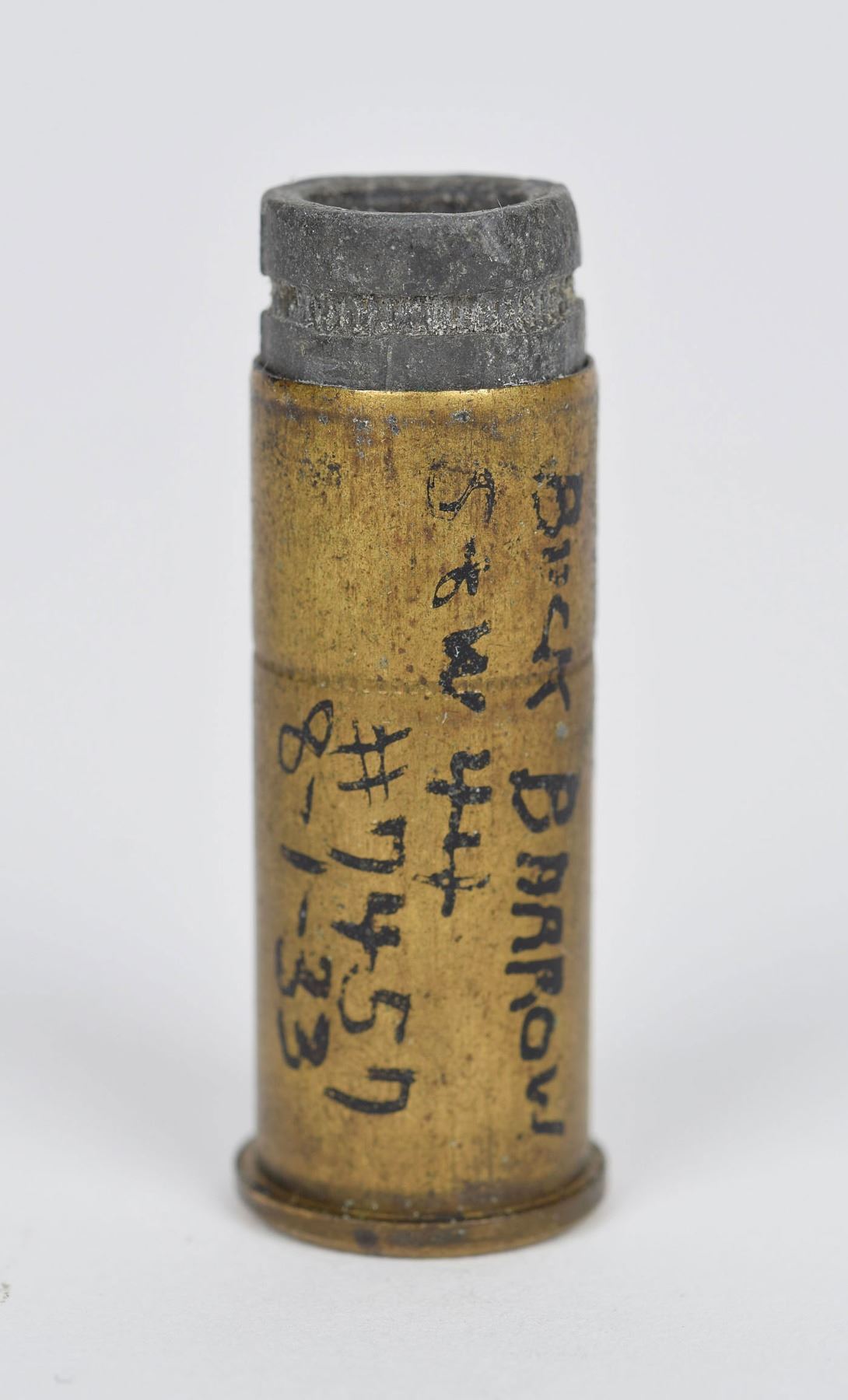 The most interesting items in the collection are: two unfired .45 ACP cartridges (one labeled “BUCK BARROW”, the other labeled “CLYDE BARROW”); one unfired .44 Special labeled “BUCK BARROW”; one fired .44 Special with recovered bullet and small paper note that reads, “Buck Barrow / 8-1-33 / 44 S&W Gill / #7457 for FBI”; and a fired .38 Special with recovered bullet and small paper note that reads, “Barrow Guns / 8-1-33 / 38 S&W / 303576 / Tested for FBI / Gill.” These notes were rolled up and inserted within the casings.