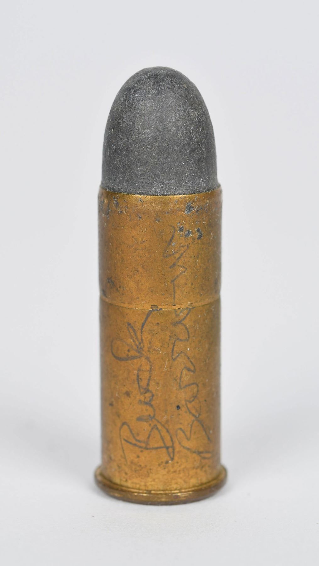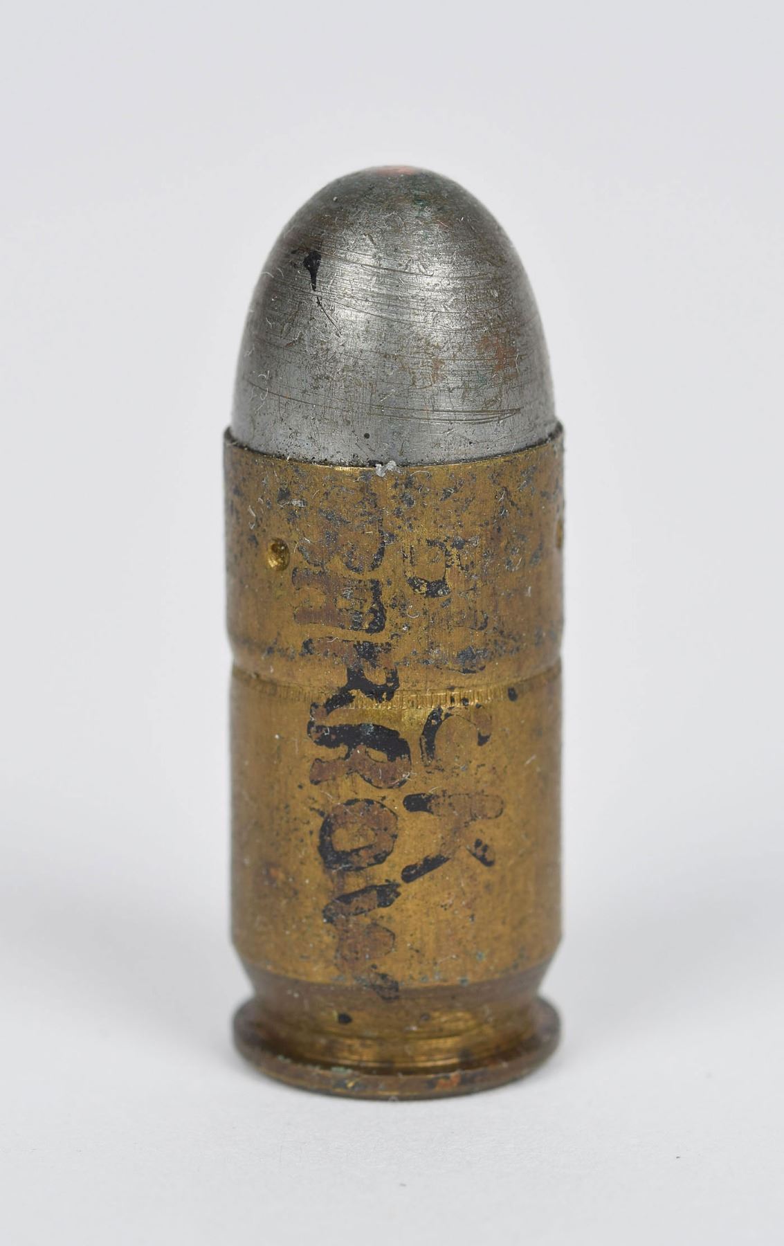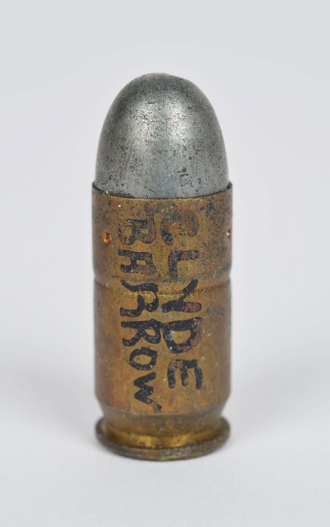 The most interesting items in the collection are: two unfired .45 ACP cartridges (one labeled “BUCK BARROW”, the other labeled “CLYDE BARROW”); one unfired .44 Special labeled “BUCK BARROW”; one fired .44 Special with recovered bullet and small paper note that reads, “Buck Barrow / 8-1-33 / 44 S&W Gill / #7457 for FBI”; and a fired .38 Special with recovered bullet and small paper note that reads, “Barrow Guns / 8-1-33 / 38 S&W / 303576 / Tested for FBI / Gill.” These notes were rolled up and inserted within the casings.