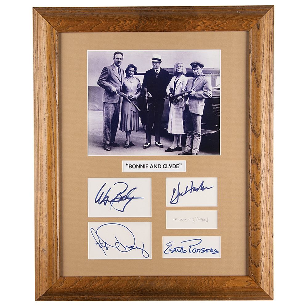 Five ink signatures of the stars of the 1967 neo-noir crime film Bonnie and Clyde—Warren Beatty, Faye Dunaway, Estelle Parsons, Gene Hackman, and Michael J. Pollard—on individual white cards, matted and framed together with a cast portrait to an overall size of 17.25 x 21.25. In fine condition.