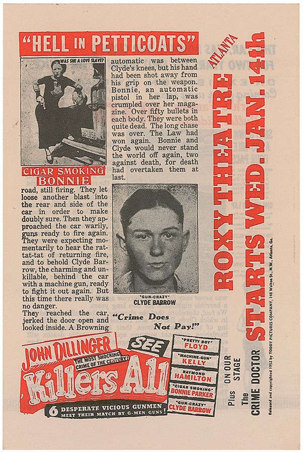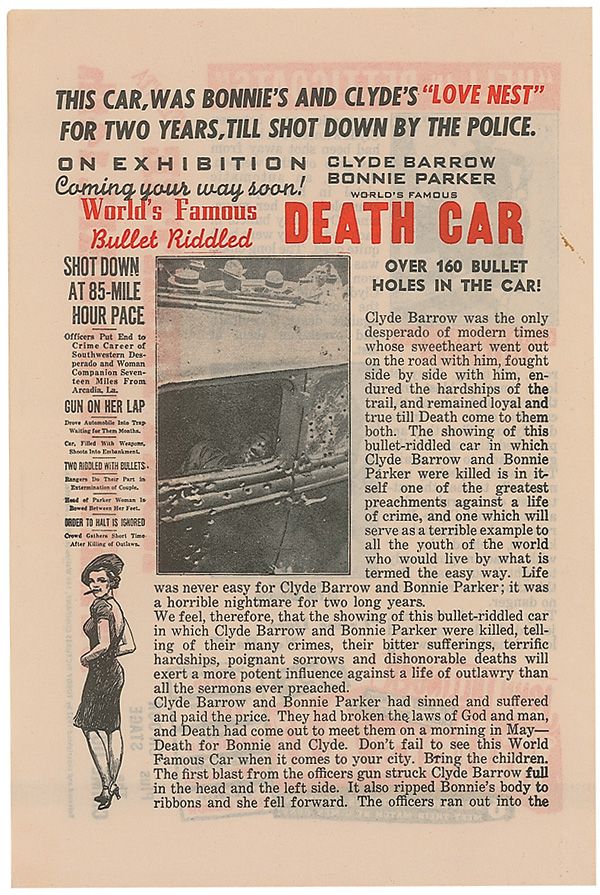 Two items: a 6 x 9 page from an advertisement for a tour of Bonnie and Clyde’s ‘Death Car,’ and other criminal items at the Roxy Theatre in Atlanta; and a limited edition booklet of Parker’s ‘Suicide Sal,’ 4 x 5.25, with the text of the story and several images of Bonnie contained inside. In fine condition.