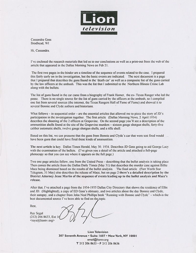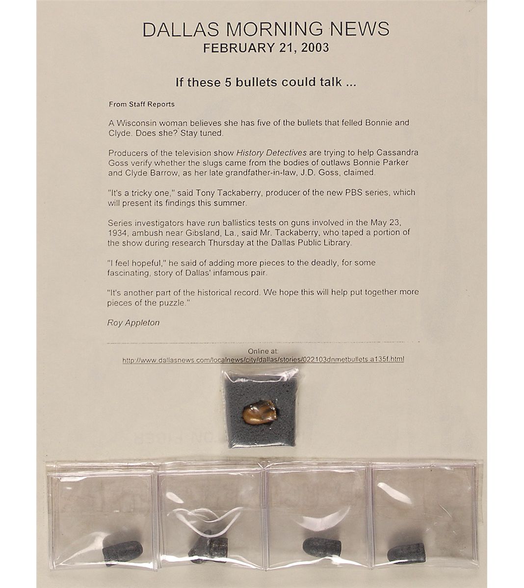 Bullets test-fired from the guns of Bonnie and Clyde and crime scene and autopsy photos. In late 2002 the producers of History’s Detectives were contacted by a woman named Cassandra Goss, who claimed to be in the possession of five bullets associated with Bonnie and Clyde. She stated that the bullets had been in her family for two generations and originated from her great grandfather-in-law, J. D. Goss.