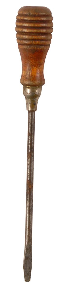 Five items originally obtained from the floor of Bonnie and Clyde’s bullet-riddled car after it was brought to Arcadia, Louisiana, along with the bodies of the notorious outlaws. Items are: A woman’s silk stocking stained with blood. Stocking measures approximately 30? long with several noticeable blood stains to the foot and leg area; an unused .45 caliber bullet and casing, stamped on the bottom of the jacket “P. C. Co 18,” standing for Peters Cartridge Company and the date of 1918; a side temple from a pair of eye glasses. Silver metallic temple measures 4? long, with screw and end piece; a small wood handled flathead screwdriver, measuring 4.5? long; and an empty Bayer Asprin tin, 1.75 x 1.25.