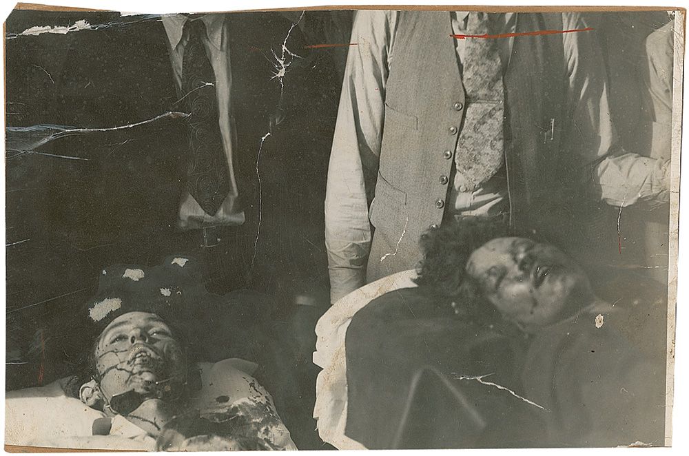 Vintage original 1934 8.25 x 5.5 gelatin silver photograph of the lifeless bodies of Bonnie and Clyde on public display shortly after their deaths. The sharp and detailed first generation image shows the heads and upper torsos of both, with several onlookers visible behind the bodies. The photo shows a variety of wear, including trimmed edges, scattered creases, crazing to finish, very small spots of paper loss above Clyde’s head and tape remnants to reverse edges, otherwise very good condition.