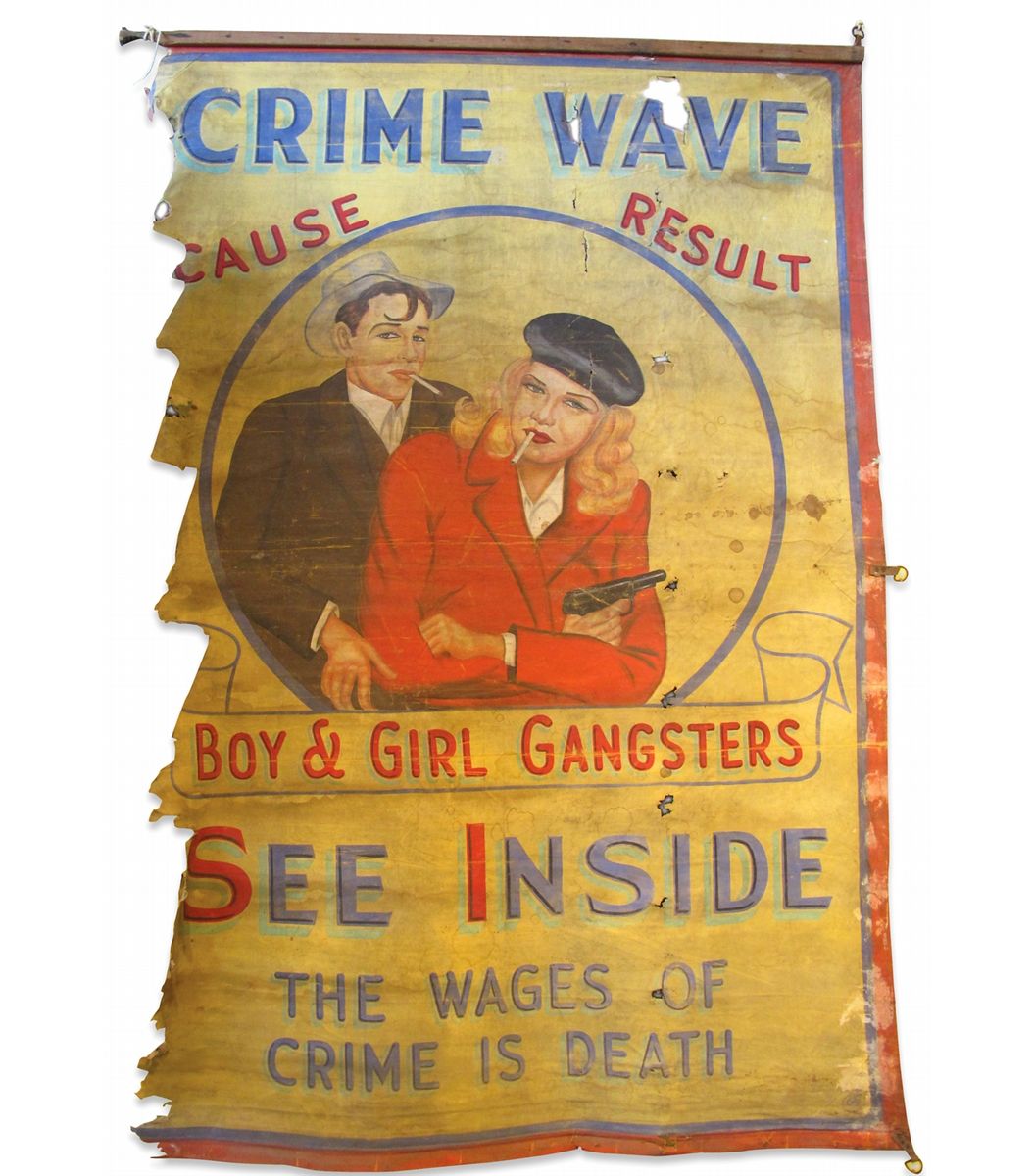 This banner measures 12' x 9', and is a side show banner dated to the early 1930s, or before simply from how the banner is hung. From these dates, side show banners were traditionally hung from having a straight board sewn in at the banners top side to simply hang the banner when arriving to the next location. This is banner is clearly fabricated like this, along with the leather attachment loops, and hardware matching a banner from this time. Soon after freak show banners started attaching corner leather loops which is how they were made until now. The banner was made in the early 1930s. The banners of this type are hand-painted works upon canvas. This banner was manufactured in Kansas, Mo. and illustrated by an artist, “Gene.” The work is signed by Gene in his monogram. Emblazoned on the banner in large print is “Crime Wave…Boy & Girl Gangsters. See Inside. The Wages Of Crime Is Death.”