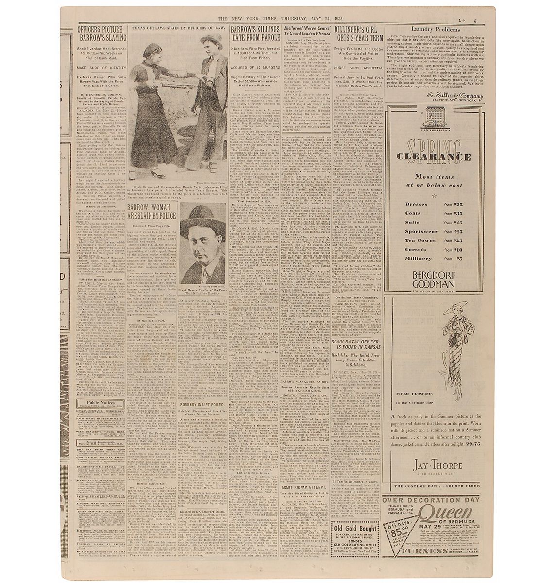 Original May 24, 1934, Late Day edition of the New York Times, 17 x 22.75, 48 pages. Page three bears several headlines and stories about the demise of Bonnie and Clyde, featuring the classic image of Bonnie holding up Clyde with a shotgun, as well as a portrait of Frank Hamer. One story is written by Bienville Parish Sheriff Henderson Jordan. Two of the smaller headlines read “Shot the Devil Out of Them,” and “50 Bullets Hit Pair.” In fine condition, with central horizontal fold, a mild shade of toning, front page folded over so page three is visible, and marginal binding holes to left edge.