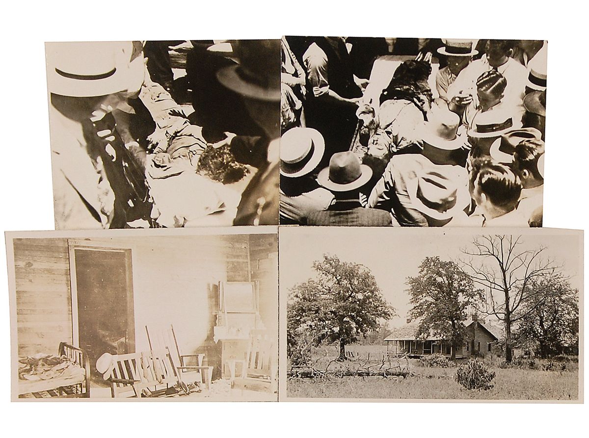 Four unsigned glossy photos, all approximately 3 x 2, one showing the exterior of their hideout, one showing the inside of the hideout, and images of Bonnie and Clyde’s bodies shortly after they were removed from their car. In fine condition, with trimmed edges to two photos.