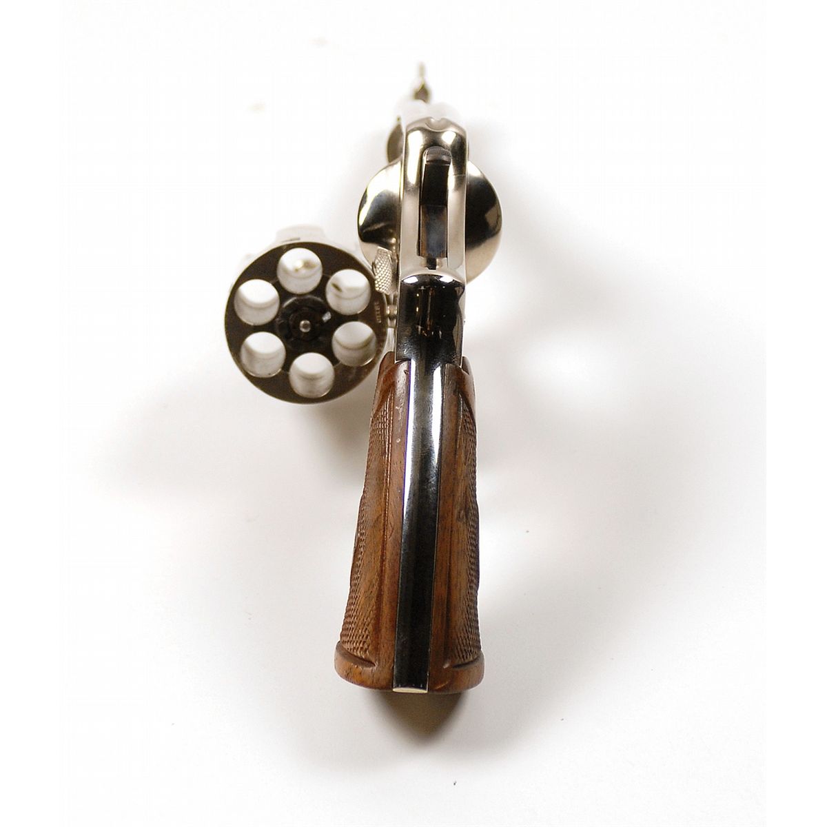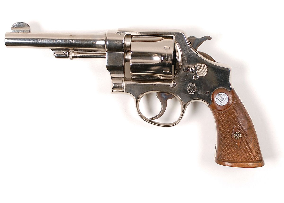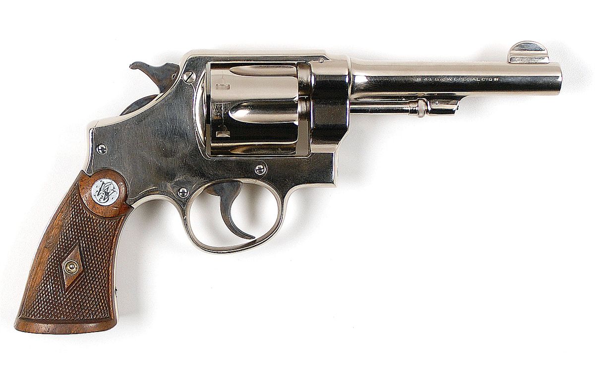 A Smith and Wesson .44 caliber revolver taken from the Bonnie and Clyde ambush vehicle. This Second Model Hand Ejector revolver, serial number 18110, was given by Sheriff Henderson Jordan to his friend Bertram F. Barnette, a local attorney and a senator in the Louisiana State Legislature. Included is a notarized Statement from Bertram Rowe Henry, M.D., and Herbert Wayne Henry, M.D. (The grandsons of Bertram F. Barnette) that relates that during their childhood years they were shown this Smith and Wesson revolver many times and that their mother and grandmother told them about the ambush of Bonnie and Clyde and how their bodies were put on display for the “town’s people to see.” They also state that Sheriff Henderson Jordan had called for their grandfather to come to his office immediately, where he found a “pile of weapons” and was invited to take one for a souvenir. “He chose the nickel plated Smith and Wesson .44 caliber pistol which which has remained in our family for over 75 years.” Also included is a copy of a signed letter from Bertram F. Barnette’s legal secretary at that time, Norma Duty, dated January 29,1986, in which she states, “I saw Clyde and Bonnie at the funeral home but did not see a weapon of any kind and am reasonably sure Sheriff Jordan was telling the truth when he told your father the gun belonged to and was in the possession of Bonnie and Clyde.” In photographs taken of the stockpile of weapons laid out on the Sheriff’s desk that day, there is a Smith and Wesson .44 caliber pistol clearly visible; the gun offered here is most likely that pistol.