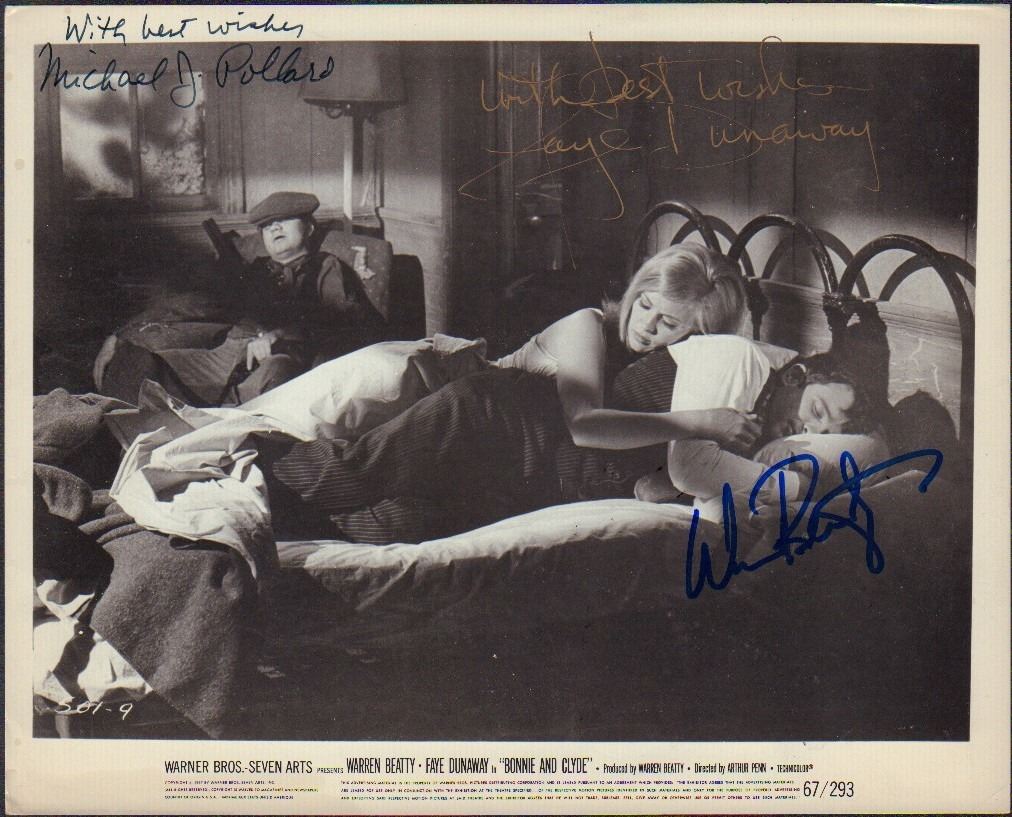 A 8x10 vintage original still signed by Warren Beatty, Faye Dunaway and Michael J. Pollard with COA.