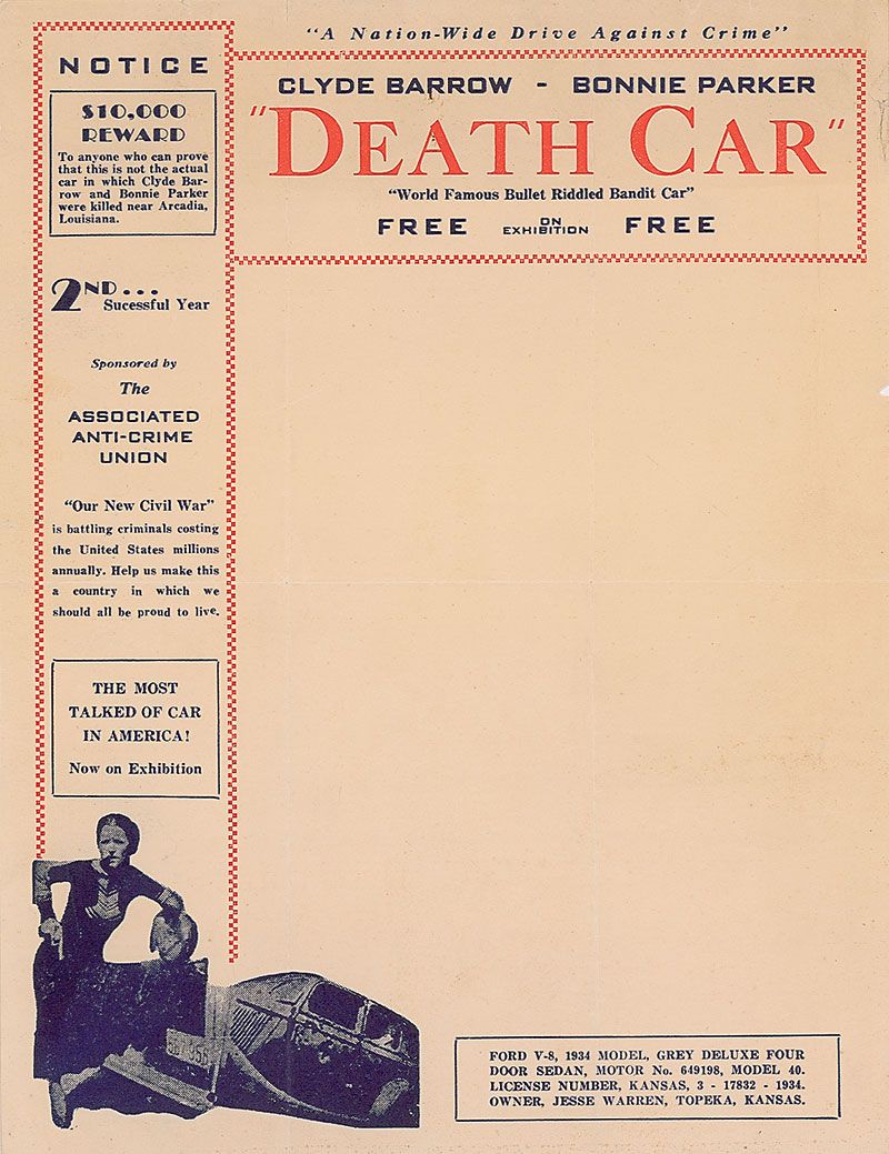 Original vintage 1930s flier announcing the appearance of Bonnie and Clyde’s death car. Flier measures 8.5 x 11, with a large banner headline at the top, an iconic image of Bonnie and the car in the lower left, and a notice offering a $10,000 reward to anyone who can prove this is not the car. The center of the flier is blank for the local information to be placed. In fine condition, with intersecting folds and a couple trivial edge chips.