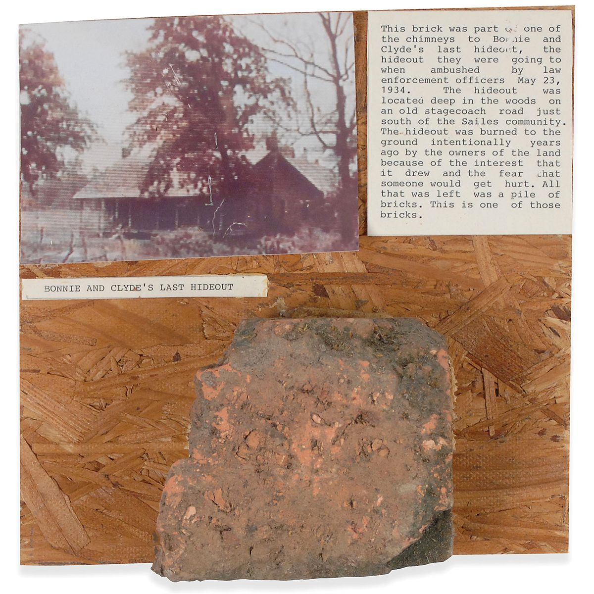 A 4.5 x 4 x 2.5 section of brick from one of the chimneys of Bonnie and Clyde’s last hideouts. Brick is affixed to a wooden board with a photo of the hideout (with two visible chimneys), and a descriptive caption which reads, “This brick was part of one of the chimneys of Bonnie and Clyde’s last hideout. The hideout they were going to when ambushed by law enforcement officers May 23, 1934. The hideout was located deep in the woods on an old stagecoach road just south of the Sailes community. The hideout was burned to the ground intentionally years ago by the owners of the land because of the interest that it drew and the fear that someone would get hurt. All that was left was a pile of bricks. This is one of those bricks.” Brick was originally obtained at the 1998 Bonnie and Clyde Festival.
