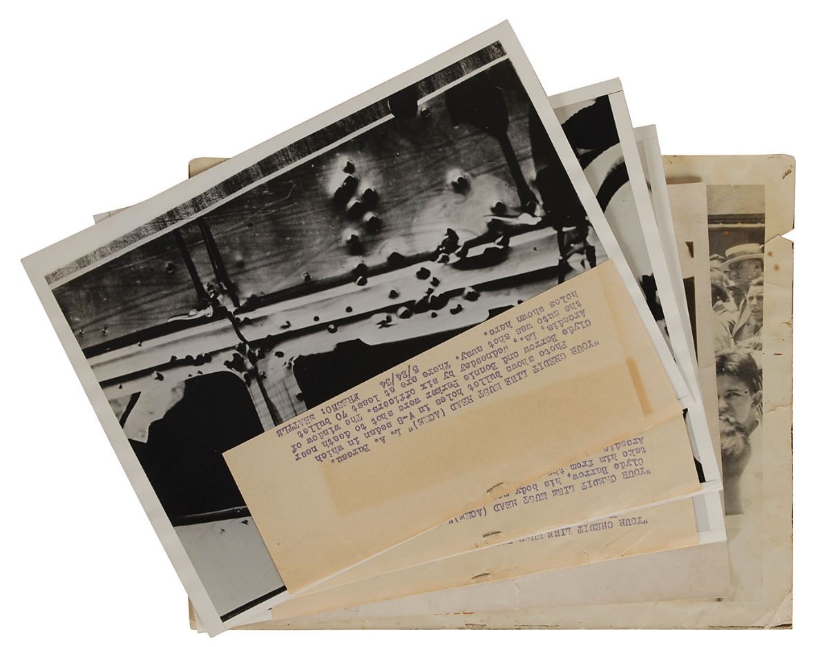 Five glossy 9 x 7 press photos related to the deaths of Bonnie and Clyde: two showing the body of Clyde Barrow; one showing the deceased Bonnie Parker being taken from the death car; one of the bullet-riddled side of the death car; and one of a crowd of people looking at the death car. Press captions are stapled at the top of most. In overall very good to fine condition.
