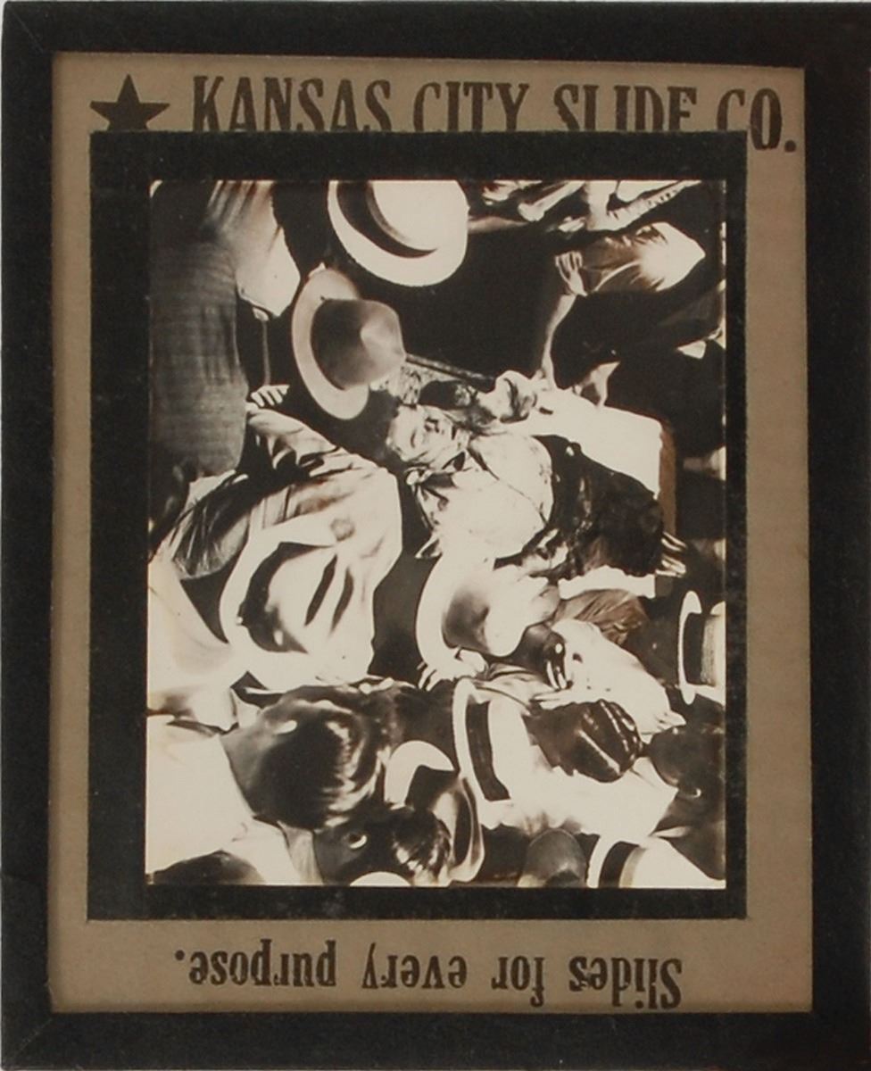 Magic lantern glass slide produced by the Kansas City Slide Co., 4 x 3.75, showing Clyde Barrow after being killed when his body was exhibited as proof of his demise. In fine condition.