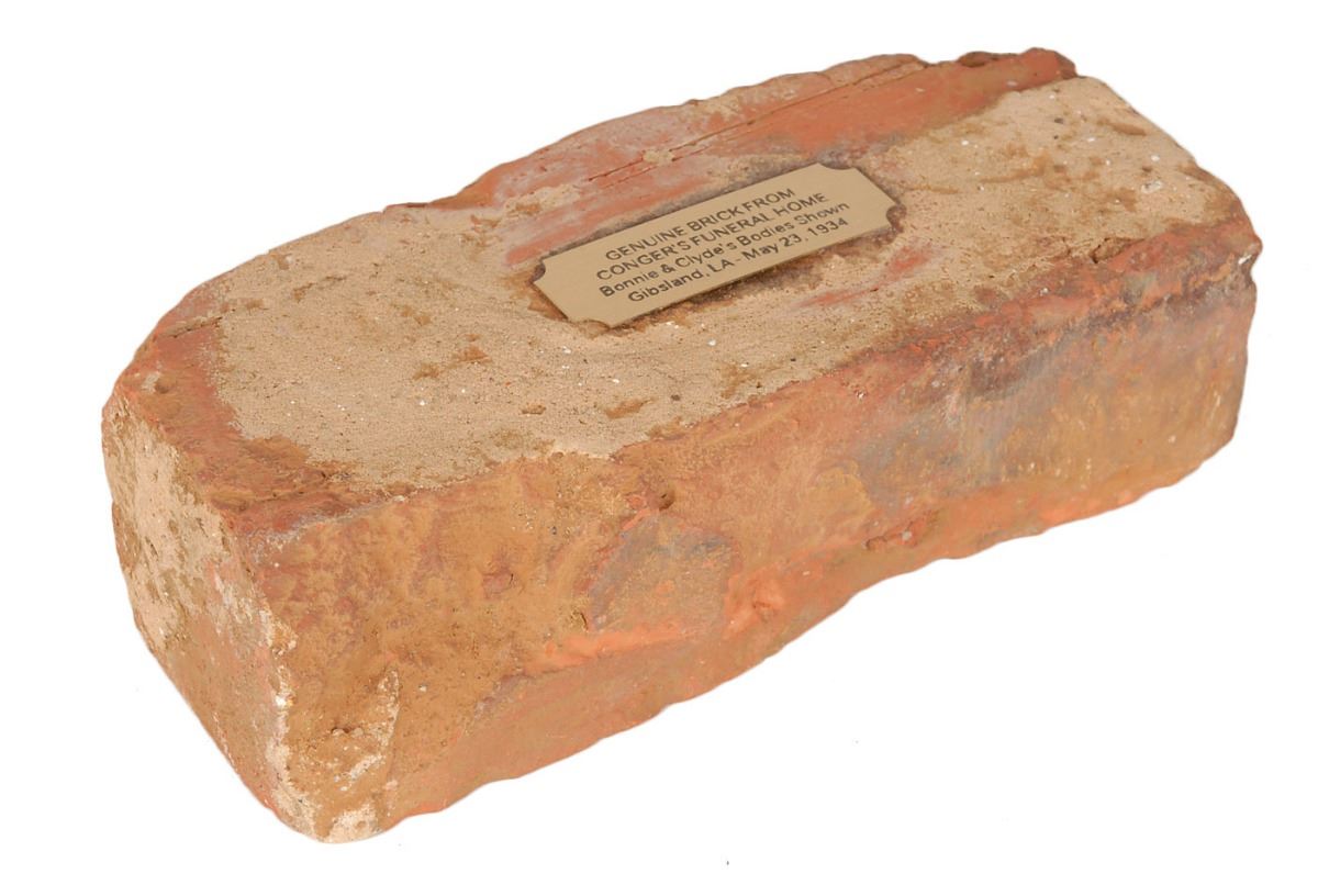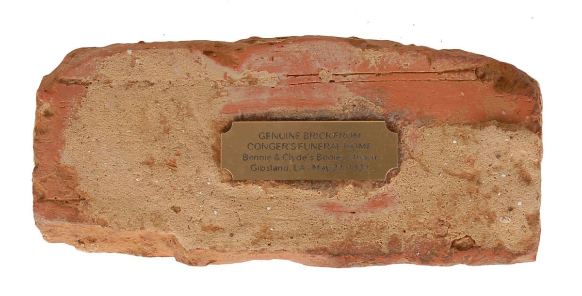 Brick from Conger’s Funeral Home in Gibsland, Louisiana, where the bodies of Bonnie Parker and Clyde Barrow were embalmed and shown after they were shot to death. The brick measures 8.75 x 4 x 2.75 and bears an engraved plaque reading, “Genuine brick from Conger’s Funeral Home, Bonnie & Clyde’s Bodies Shown, Gibsland, LA, May 23, 1934.” In fine condition.