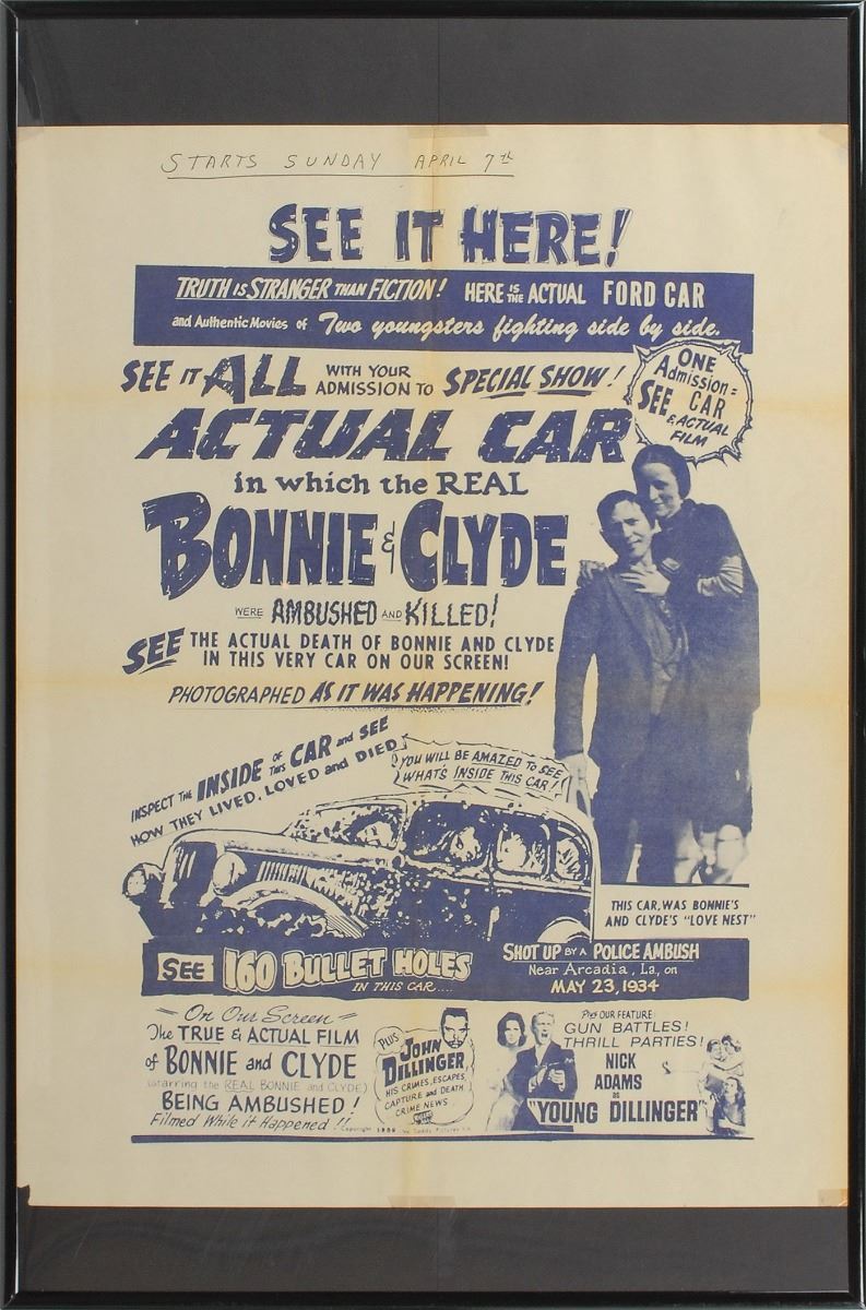Four posters advertising the touring Bonnie and Clyde ‘death car,’ which was exhibited around the nation for many years following their deaths, including: a matted and framed 11 x 16 advertisement from a 1934 newspaper from Arcadia, Louisiana, touting the “Most Talked of Car in America,” promising an “Educational and Instructive Exhibition”; a circa 1960s poster for a gangster car exhibit at the Oklahoma State Fair, 22 x 28, including Bonnie and Clyde’s “V8 Bullet Riddled Death Car” and Mickey Cohen’s “$25,000 Armor Plated Bullet Proof Gangster Car”; a circa 1960s poster for a “stranger than fiction” show, 22 x 28, including an exhibit of the death car and two movies for the price of admission; and a circa 1960s full 17.5 x 22 sheet of four uncut ads for the Bonnie and Clyde death car and Mickey Cohen bulletproof car exhibition. In overall very good to fine condition.