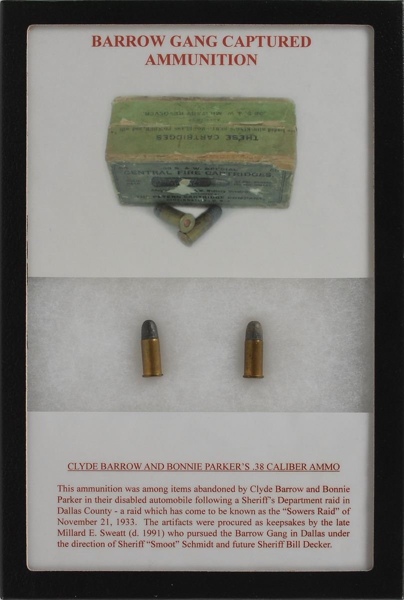 Two .38 caliber bullets recovered from the disabled car of Bonnie Parker and Clyde Barrow following the ‘Sowers Raid’ conducted by a Dallas Sheriff’s posse on November 22, 1933. Displayed with a caption and image of the original ammunition box. In fine condition. Consignor notes that the gunpowder was removed by a professional gunsmith. These bullets were among the items collected at the scene by one of the deputies, Millard Sweatt, and they are accompanied by a packet of provenance material describing Sweatt’s career.