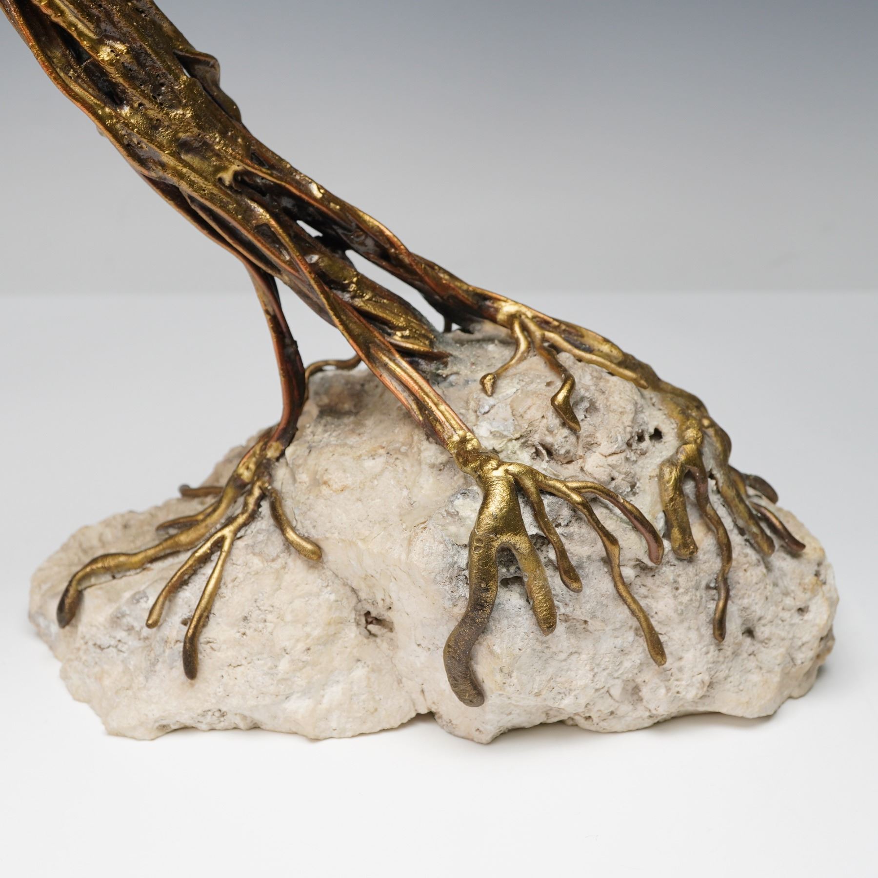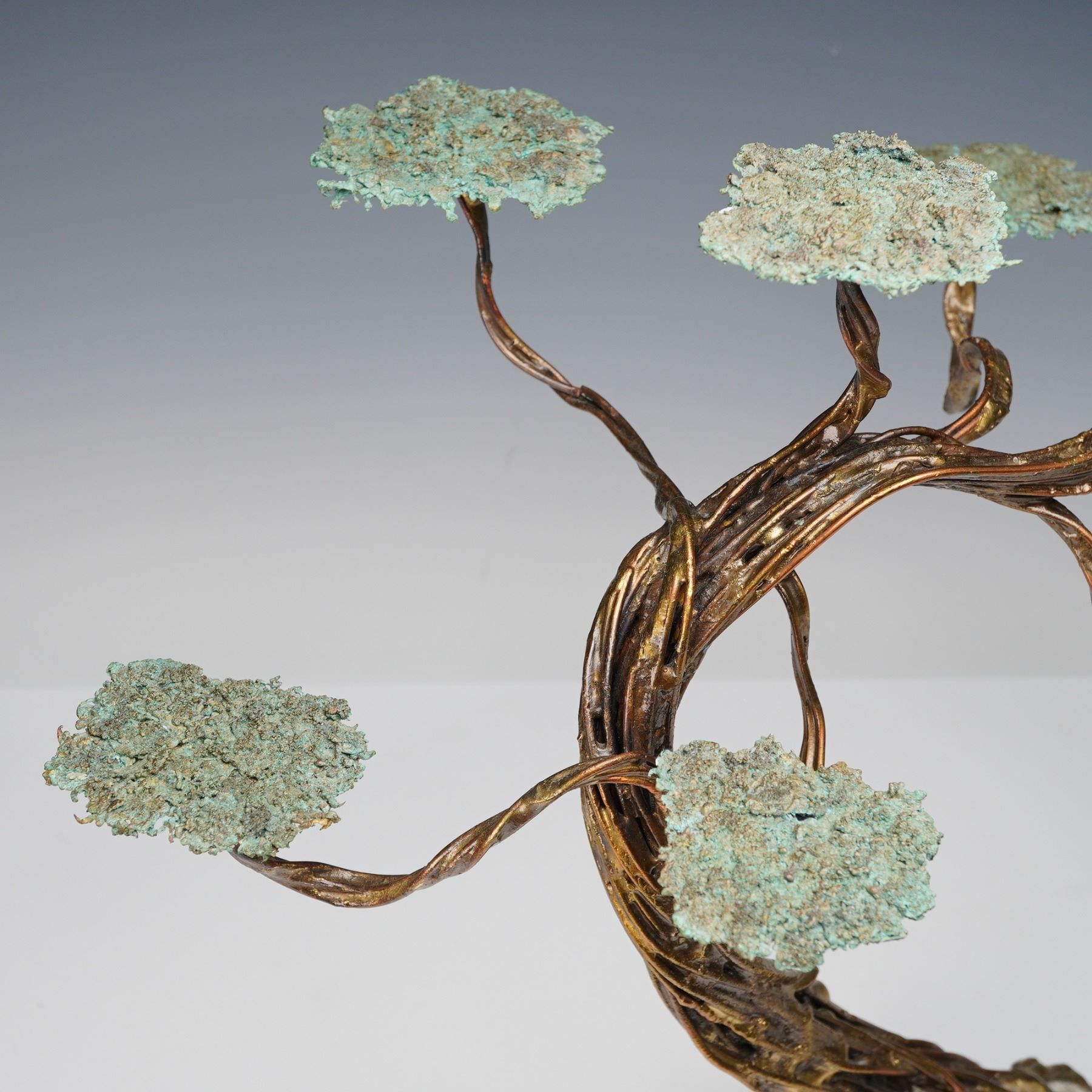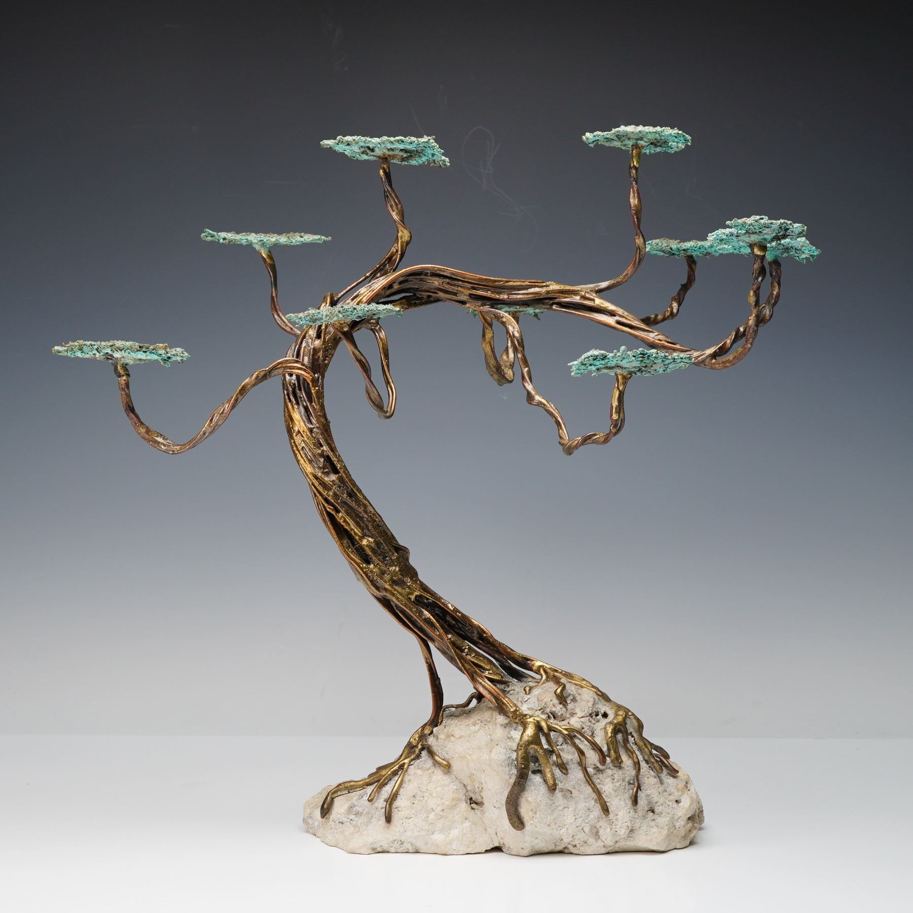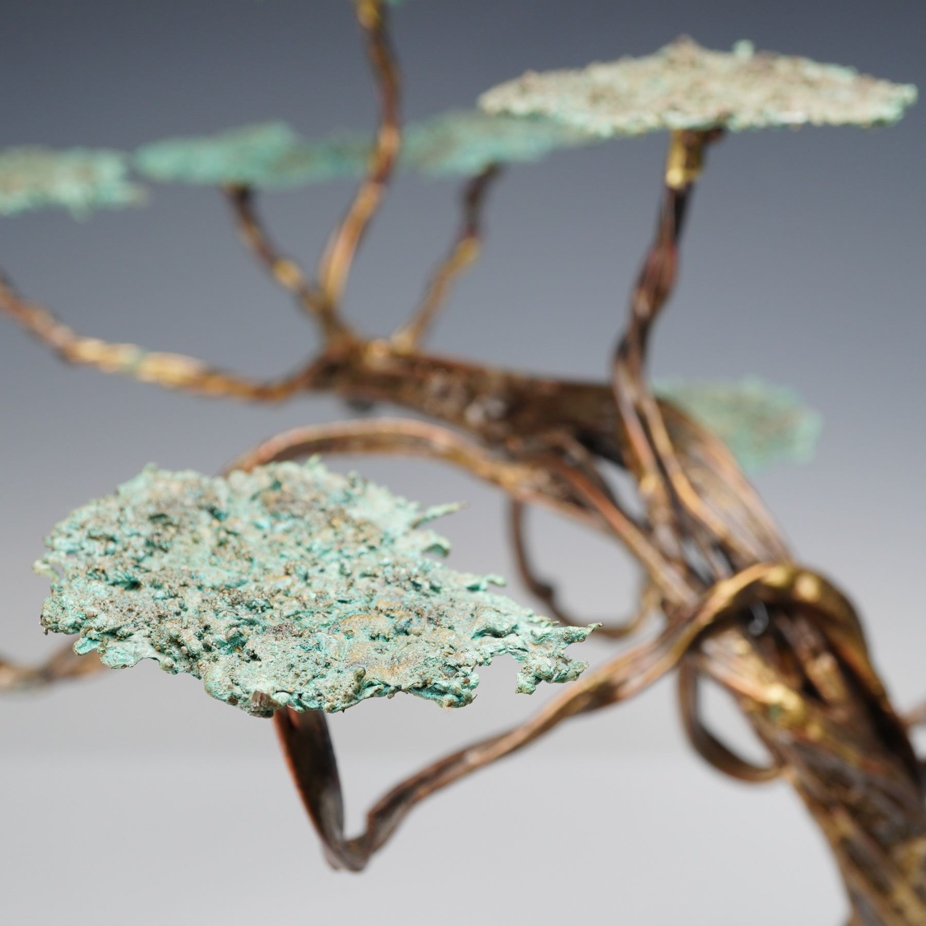 Handcrafted bonsai tree sculpture composed of twisted brass and copper wire with verdigris-patinated foliage, mounted on a natural stone base. The flowing trunk and exposed roots create a dynamic, windswept composition that balances organic movement with fine metal artistry. A striking decorative sculpture evoking the harmony of nature and craftsmanship.