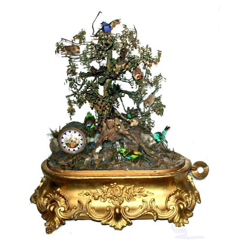 Bontems Automated Birds & Clock with glass dome. Two-train movement, strikes on bell. Gilt brass bezel, papier-mache landscape, foliage, glass waterfall. Eleven birds, some with movements, perched on tree limbs.