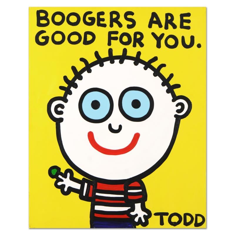 "Boogers Are Good for You" is an original acrylic painting on canvas by Todd Goldman, hand signed by the artist. This piece comes gallery wrapped. Includes Certificate of Authenticity. Measures approx. 24" x 30" (image). There is minor wear on the corners and edges of this piece.