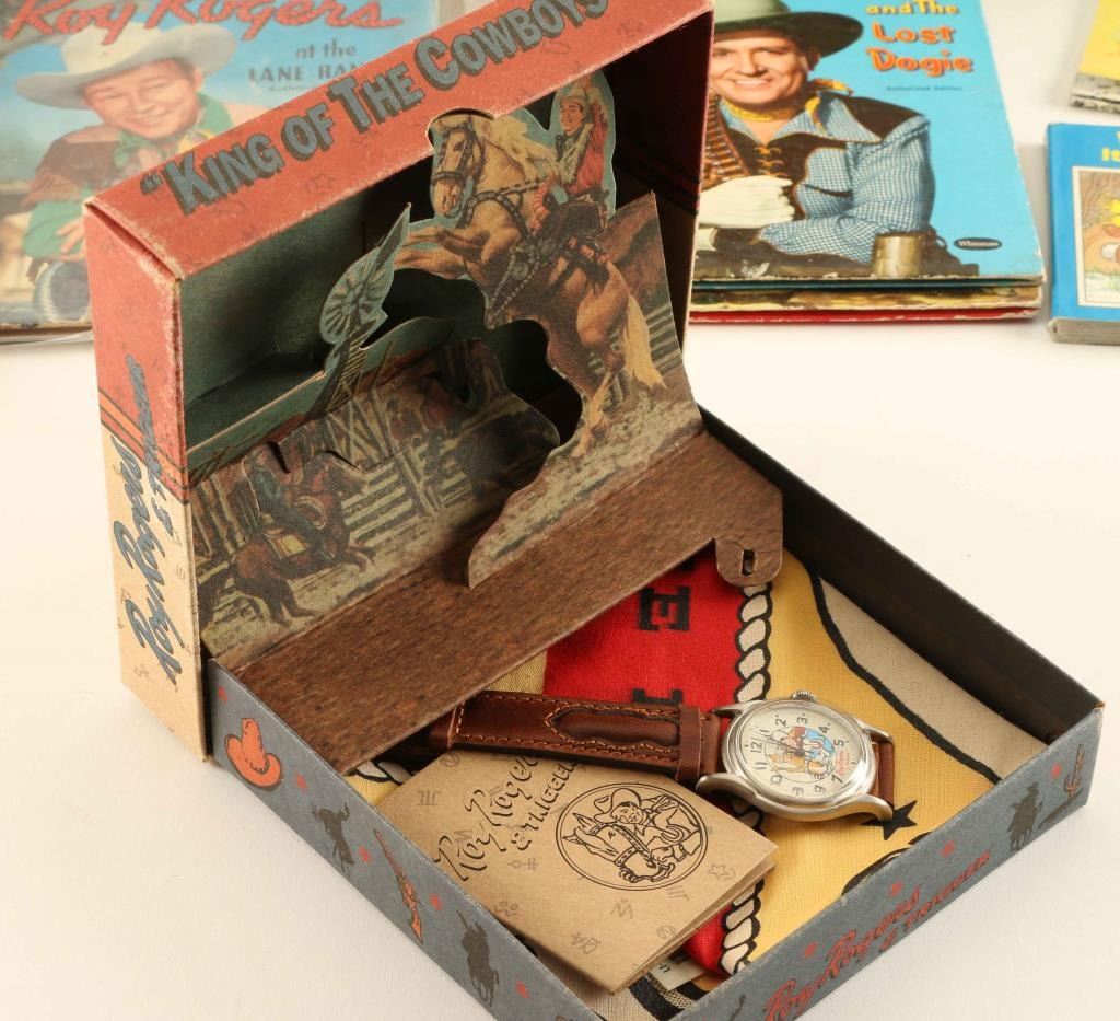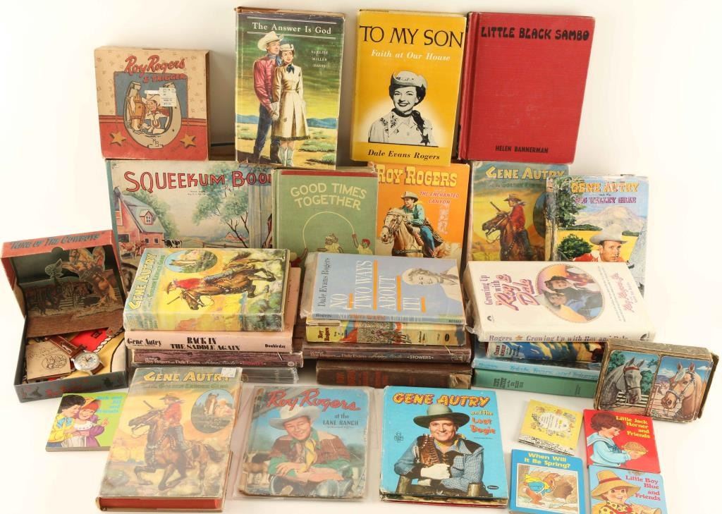 Including: Back in the Saddle Again by Gene Autry, To My Son Faith at Our House by Dale Evans Rogers, Gene Autry and the Golden Ladder Gang, Gene Autry and the Big Valley Grab, The Story of Roy Rogers and Dale Evans Happy Trails with Carlto Stowers, Roy Rogers King of the Cowboys, other assorted children's books and playing cards. Also included is a Roy Rogers & Trigger watch in original box.
