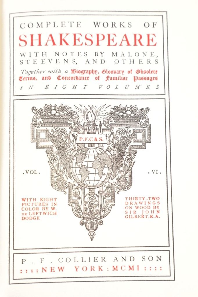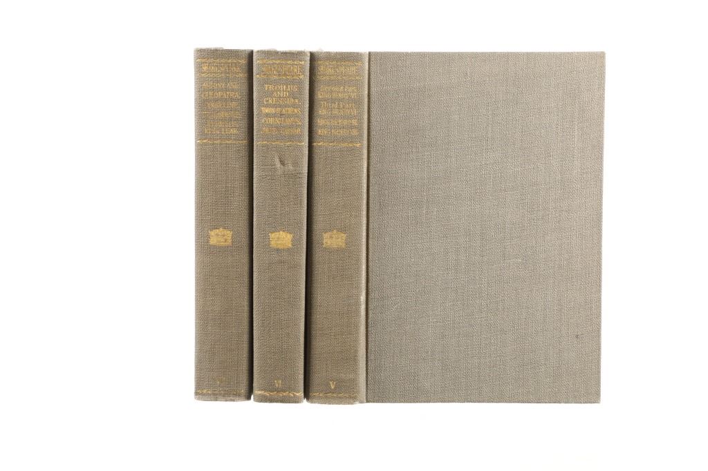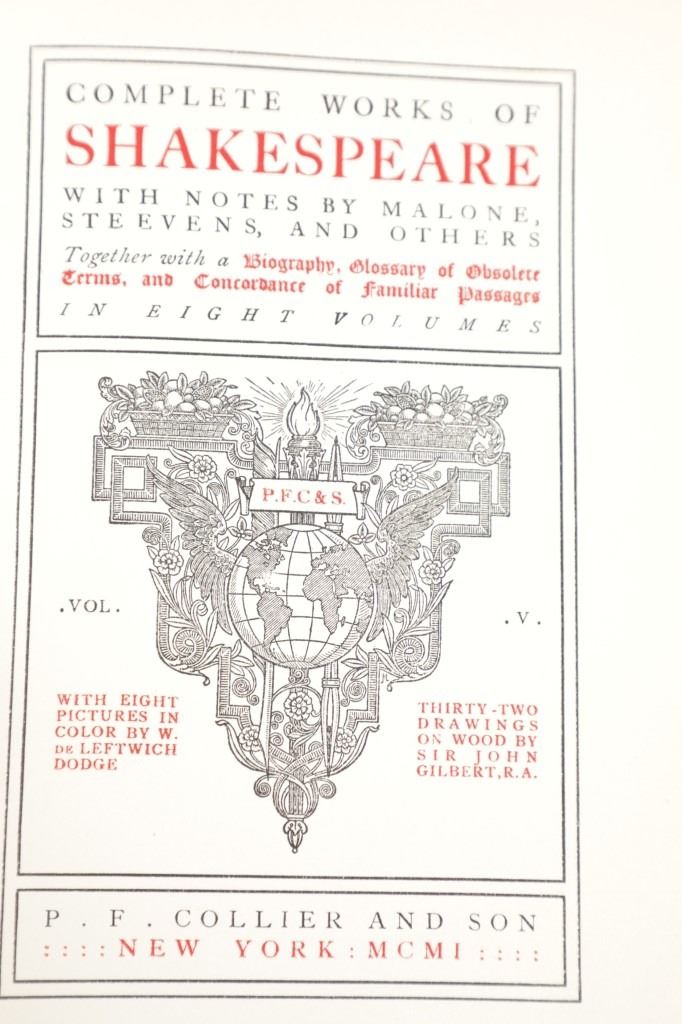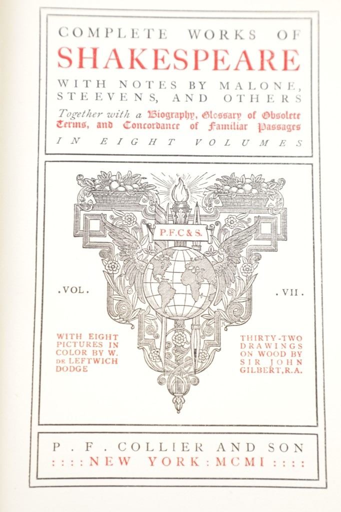 Featured in this lot is this book collection of The Complete Works of Shakespeare Vol. V-VII by P.F. Collier and Son. There are three volumes in this collection. The Complete Works of Shakespeare with notes by Malone, Stevens and others published by P. F. Collier and Son, New York. Volumes I to VII. Hardcover in elegant green fabric, gilt lettering and decor. The condition of this of this collection of books is good with some slight wear to the cloth wrapped cover and shows very slight browning to the pages of the books. The measurements of this book collection is 9" x 6 3/8". The collective weight of this collection of books is 5lb 12oz.