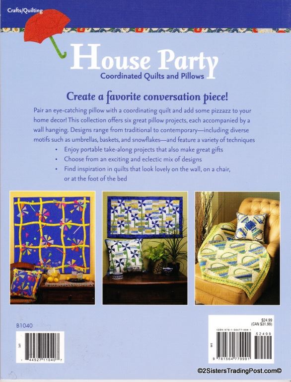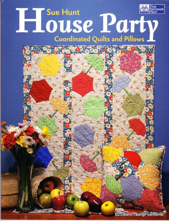 Soft cover book 'House Party Coordinated Quilts and Pillows' designs by Sue Hunt for That Patchwork Place. This is a 78 page book with 6 designs of Pillow and matching wall hanging patterns. Book is in very good condition MSRP $24.99