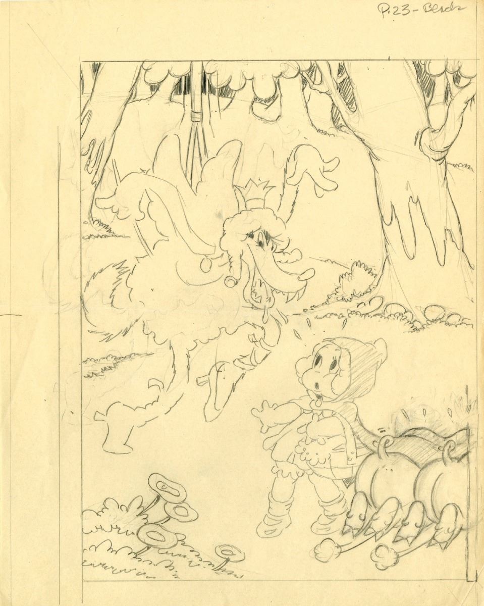 (Walt Disney Studios, 1934) A beautiful page design from "The Big Bad Wolf and Little Red Riding Hood". Accomplished in graphite on 12"x9.5" animation paper. In very good condition with a horizontal crease through the center of the sheet. Note in the top right corner reads "P.23 - Black".
