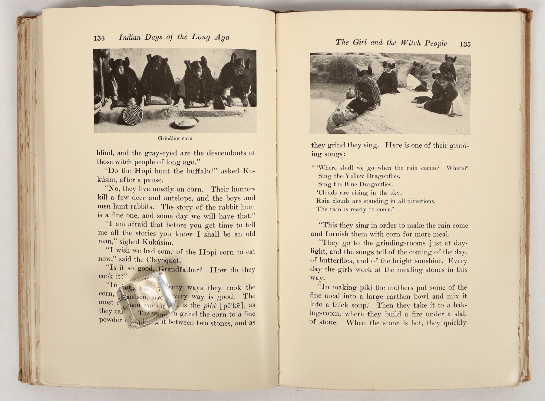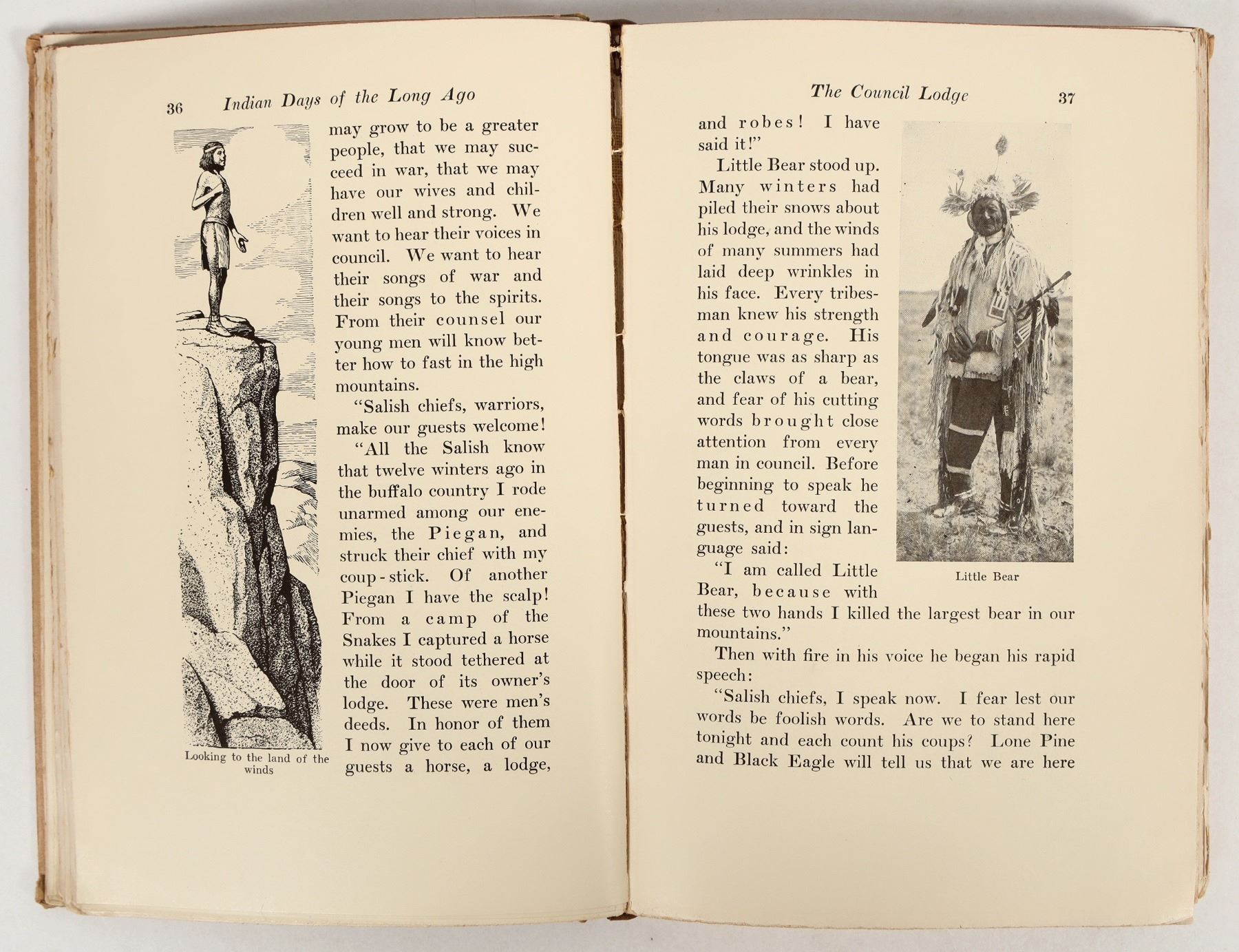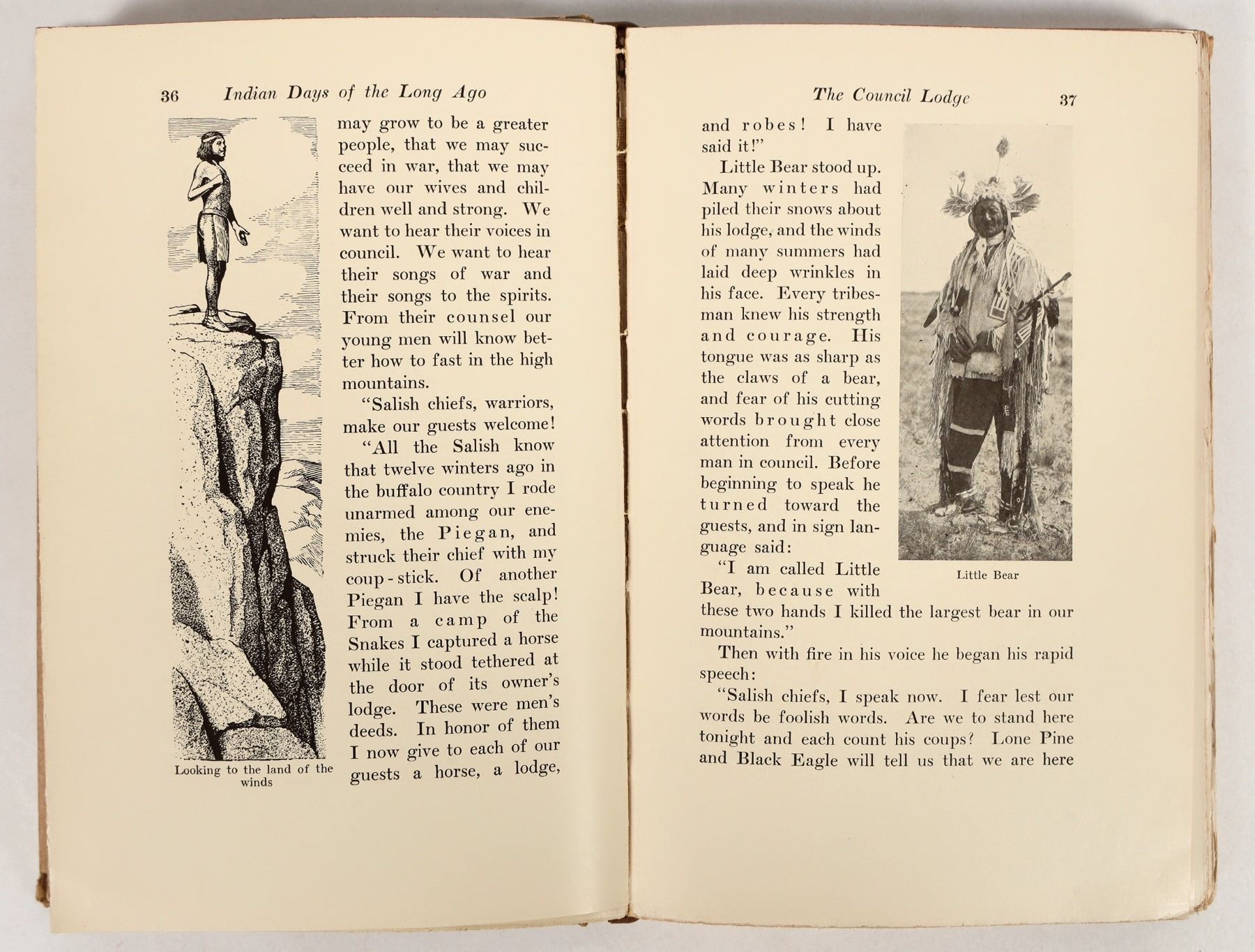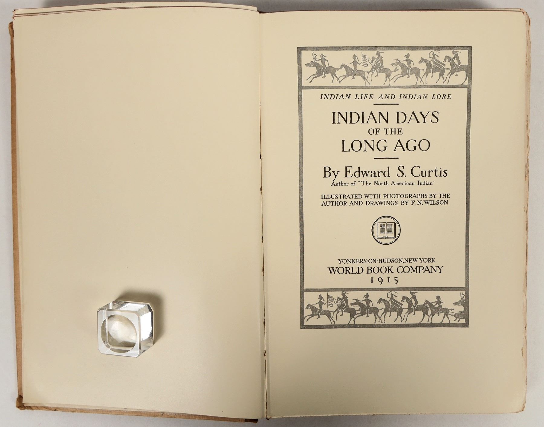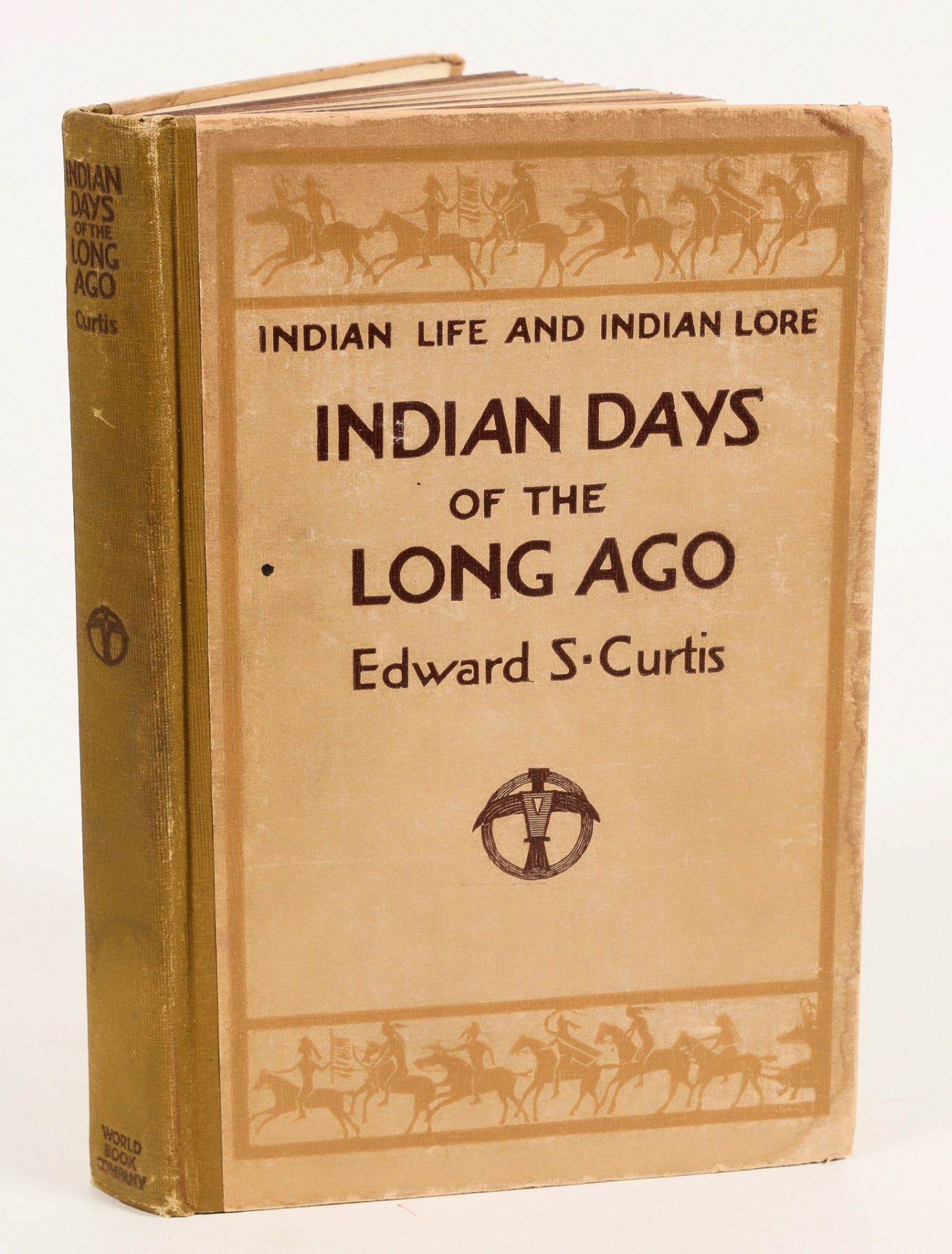 This book "Indian Days of the Long Ago" by Edward S. Curtis, copyrighted in 1914. It is profusely illustrated with photographs by the author and drawing by F.N. Wilson. Many of the photographs will be unique to this book. At 221 pages with rag edge pages. Slight water damage on the outside cover, foxed corners. The photography is spectacular as are the drawing illustrations. Overall very good condition. Inside leaf is signed by the owner "Marshall Sayles/ San Diego". Please see photos for details.
