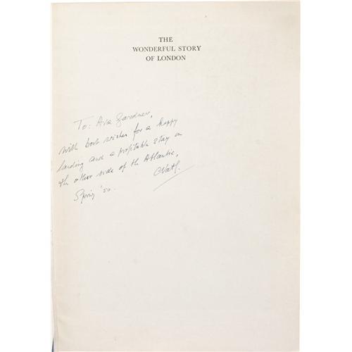 <B>Copy of "Wonderful Story of London" Inscribed to Ava Gardner by Ogden Nash.</B></I> A copy of the history volume, inscribed "To: Ava Gardner, with best wishes for a happy landing and a profitable stay on the other side of the Atlantic. Spring '50" and signed "Nash" in blue ink. Ava had appeared in <I>One Touch of Venus</B></I> two years earlier; the movie was based on a novel by F. Anstey that had previously been adapted by for the stage by Nash. In Fine to Very Condition with mild to moderate scuffing and wear, a faded spine, and a loose front cover, supple white pages and an <I>ex-libris</B></I> plate on inside front cover. <I>From the Ava Gardner Estate.</B></I><BR><BR><b>Shipping:</b> Books & Catalogs (<a target="_blank" href="http://www.heritageauctions.com/common/shipping.php">view shipping information</a>) <BR><BR><B>Important notice:<