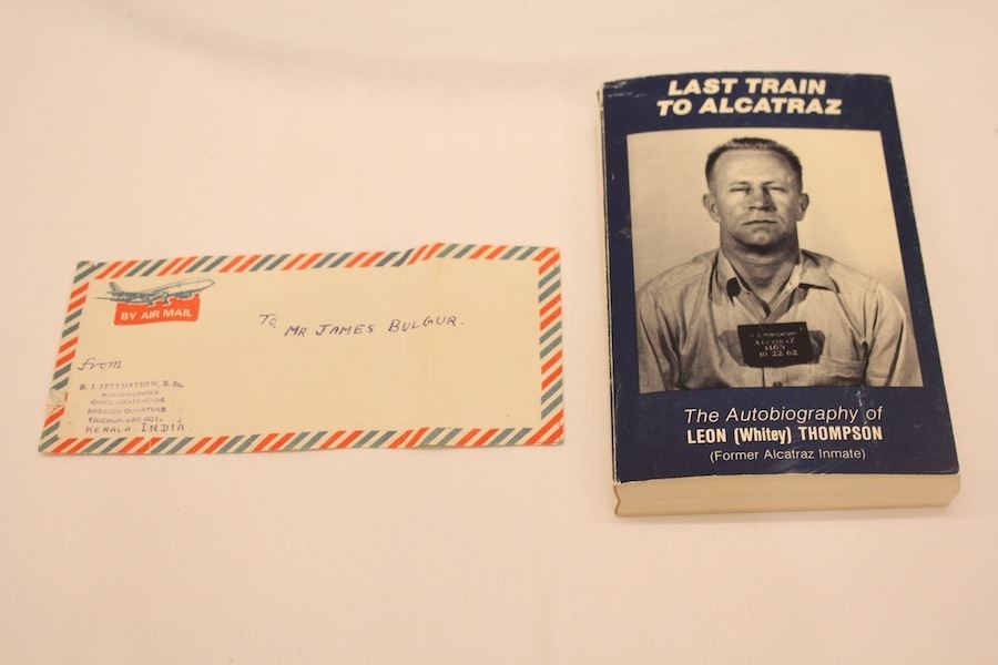 Book-Last train to Alcatraz - Autographed to Bulger from Author, Business Card as bookmark, Handwritten Note by Bulger. Empty overseas envelope to James Bulger from India. ** Personal Asset Formerly Belonging to James "Whitey" Bulger or Catherine Greig.