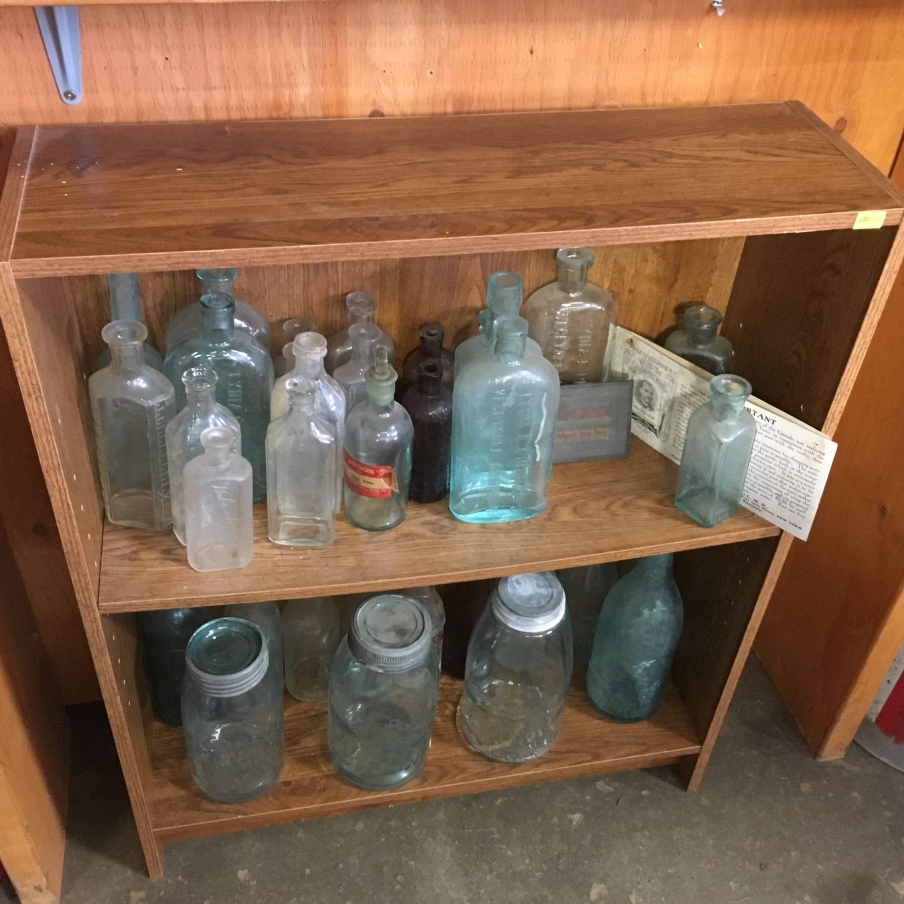 Book Shelf with Pharmacy & Beer Bottle Collection, Jars & Ephemera !!!!