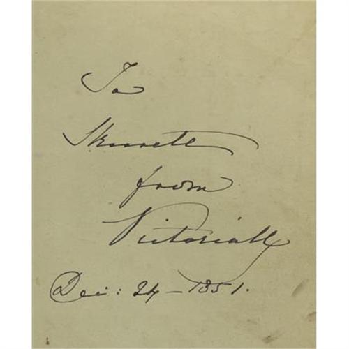 <B>Book Signed by Queen Victoria, Given as a Gift for Christmas, 1851 </B></I><BR><BR>Hardbound book entitled <I>Tales From Cat Land</B></I>, by an Old Tabby, signed by Victoria, Queen of England (r. 1837-1901), as a Christmas present to her dresser Skirrete, dated December 24, 1851, with illustrations by Harrison Weir, published by Grant and Griffith, London, 1851, with green leatherette embossed cover with gilt tooling, 7 x 5 in. <BR><BR>