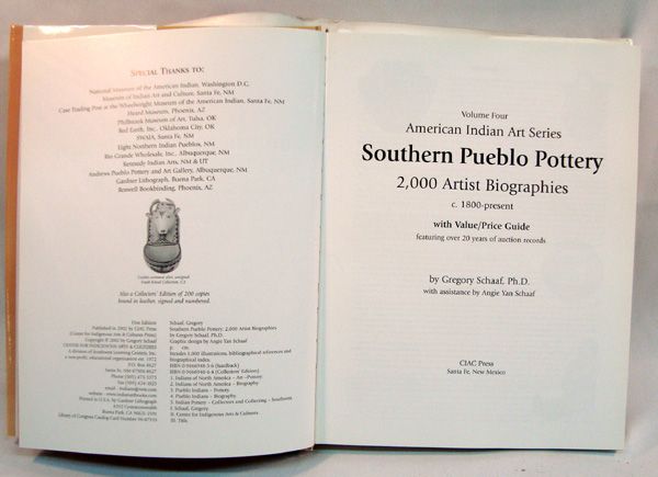 Book: Southern Pueblo Pottery 2,000 Artist Biographies by Gregory Schaff. In my opinion like new condition, has dust cover. Measures approx. 11''H x 9''W.
