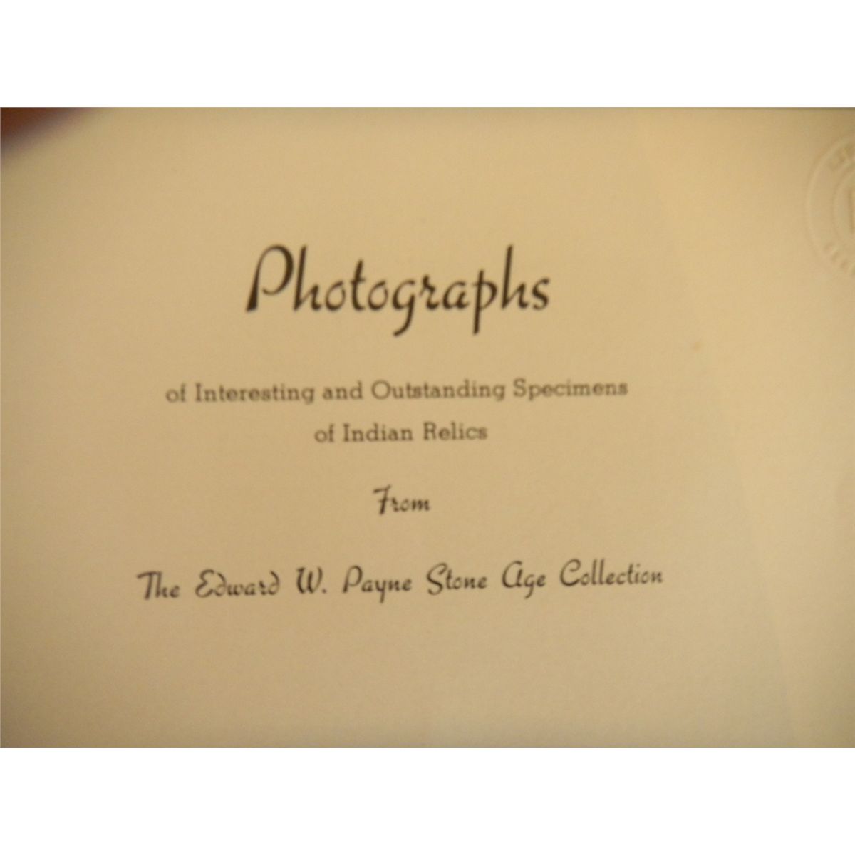 Book is titled "Photographs of Interesting and Outstanding Specimens of Indian Relics" from the Edward W. Payne Stone Age Collection, cc 1937 by First National Bank of Springfield, published Williamson Printing and Publishing Company Springfield, Ill. Shipping $10.50