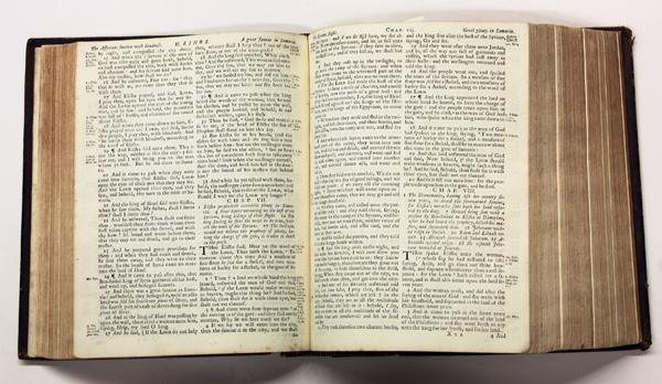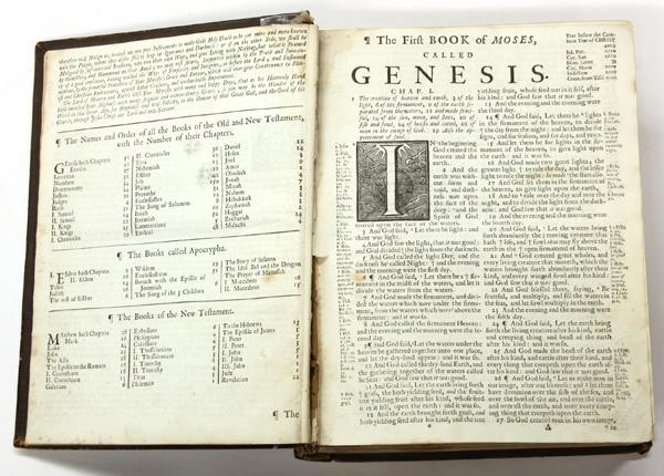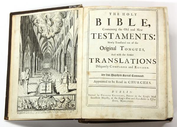 Book, The Holy Bible, Containing the Old and New Testaments, Newly translated out of the Original tongues, and with the former translations Diligently Compared and revised, 1739, George Grierson, Dublin, bound in contemporary calf, with raised bands, 10.5'' x 8.5'' x 3.5''
