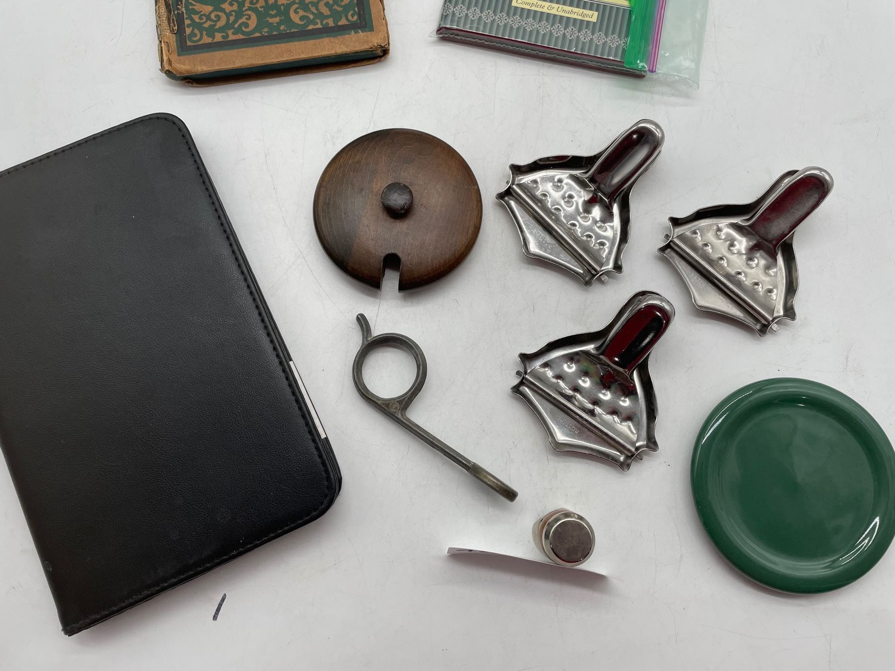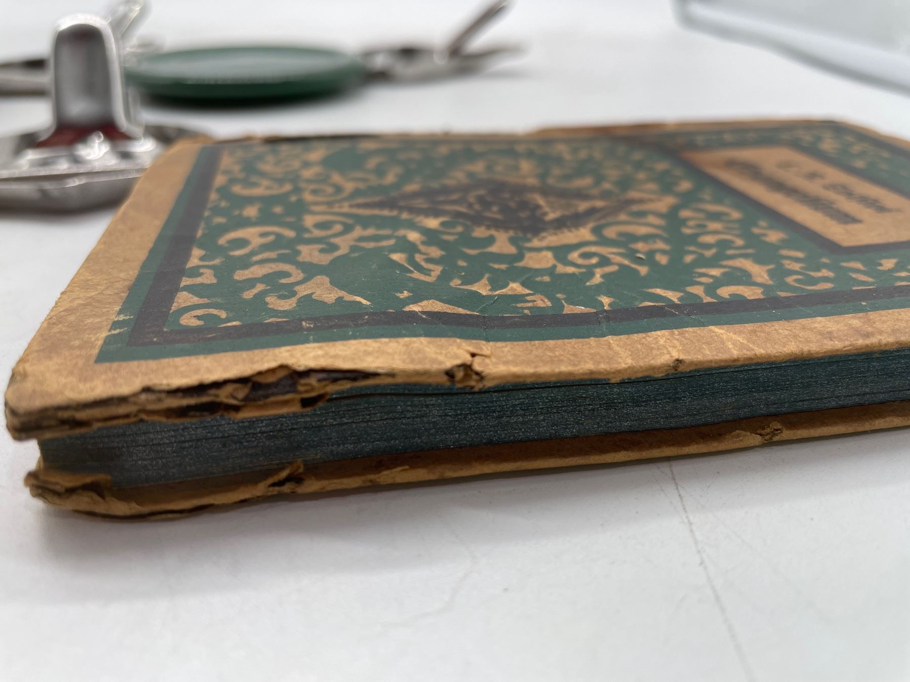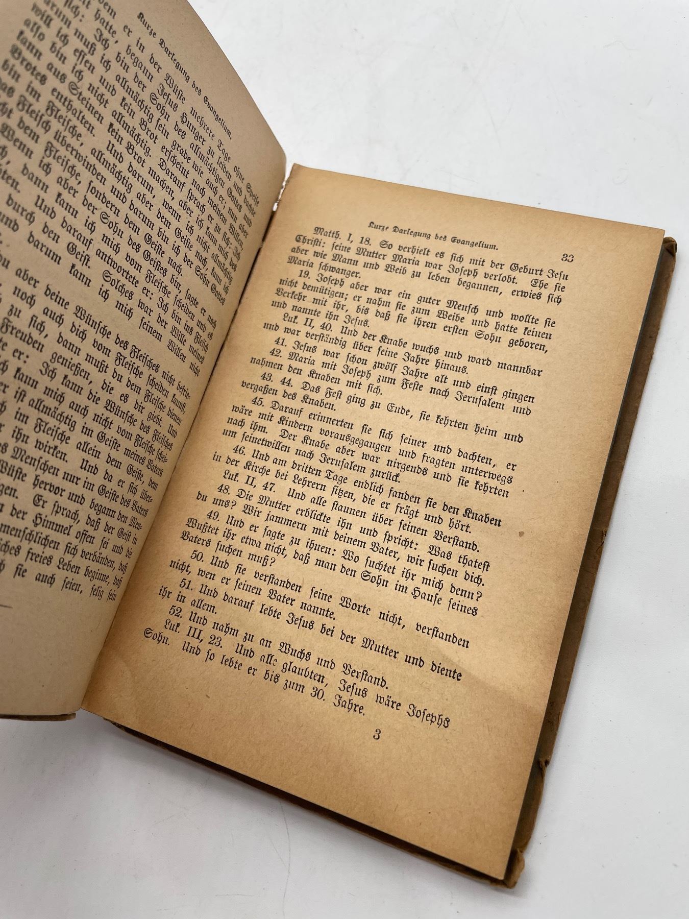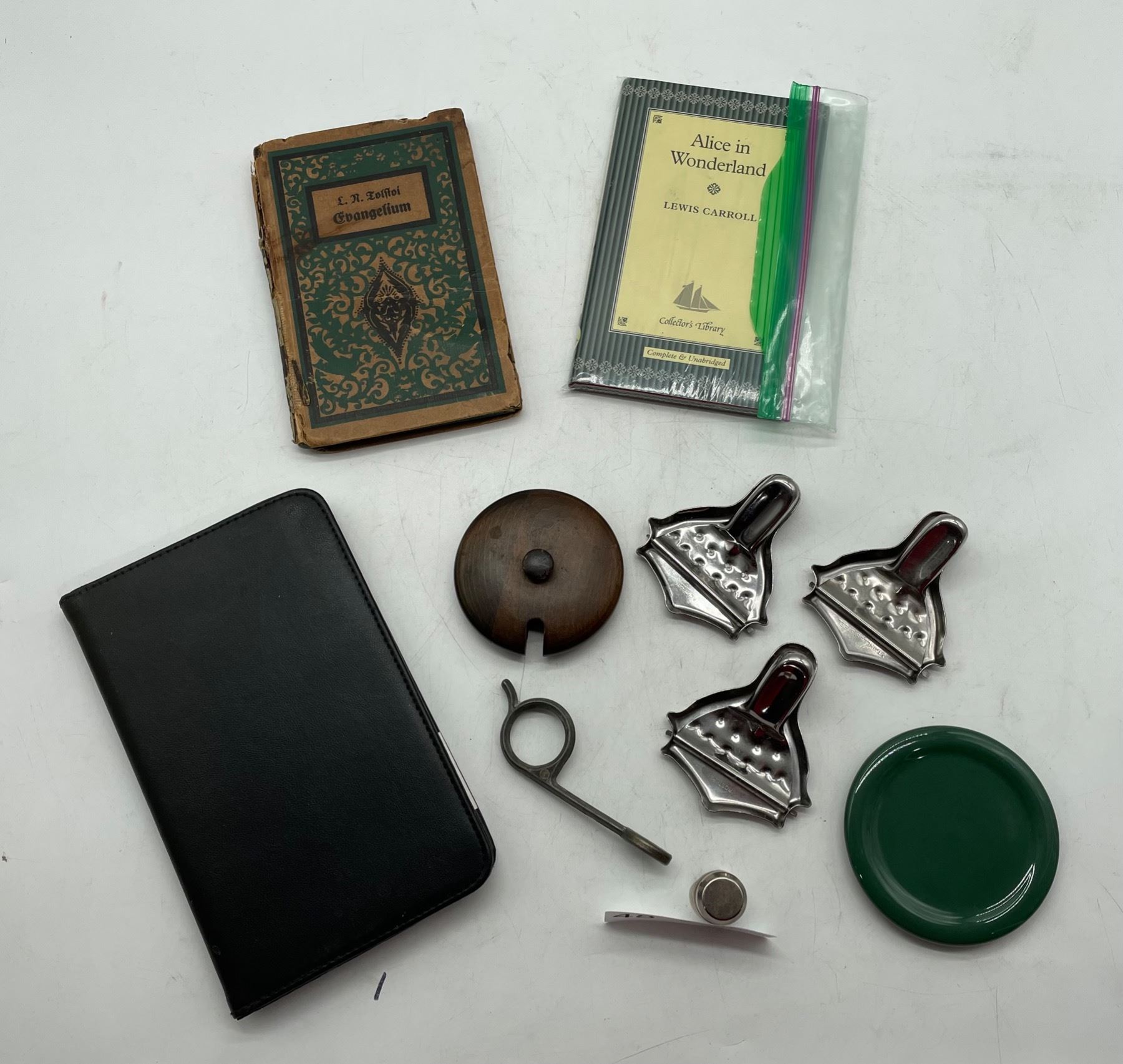 Antique book "Evangelium" meaning 'good news' or 'Gospel' written in German, Published 1892. Book is in shabby condition. Spine is worn, but book is in tact with all pages present. Book measures 6 inches x 4 inches. Lot includes small Alice in Wonderland book and various other items pictured.