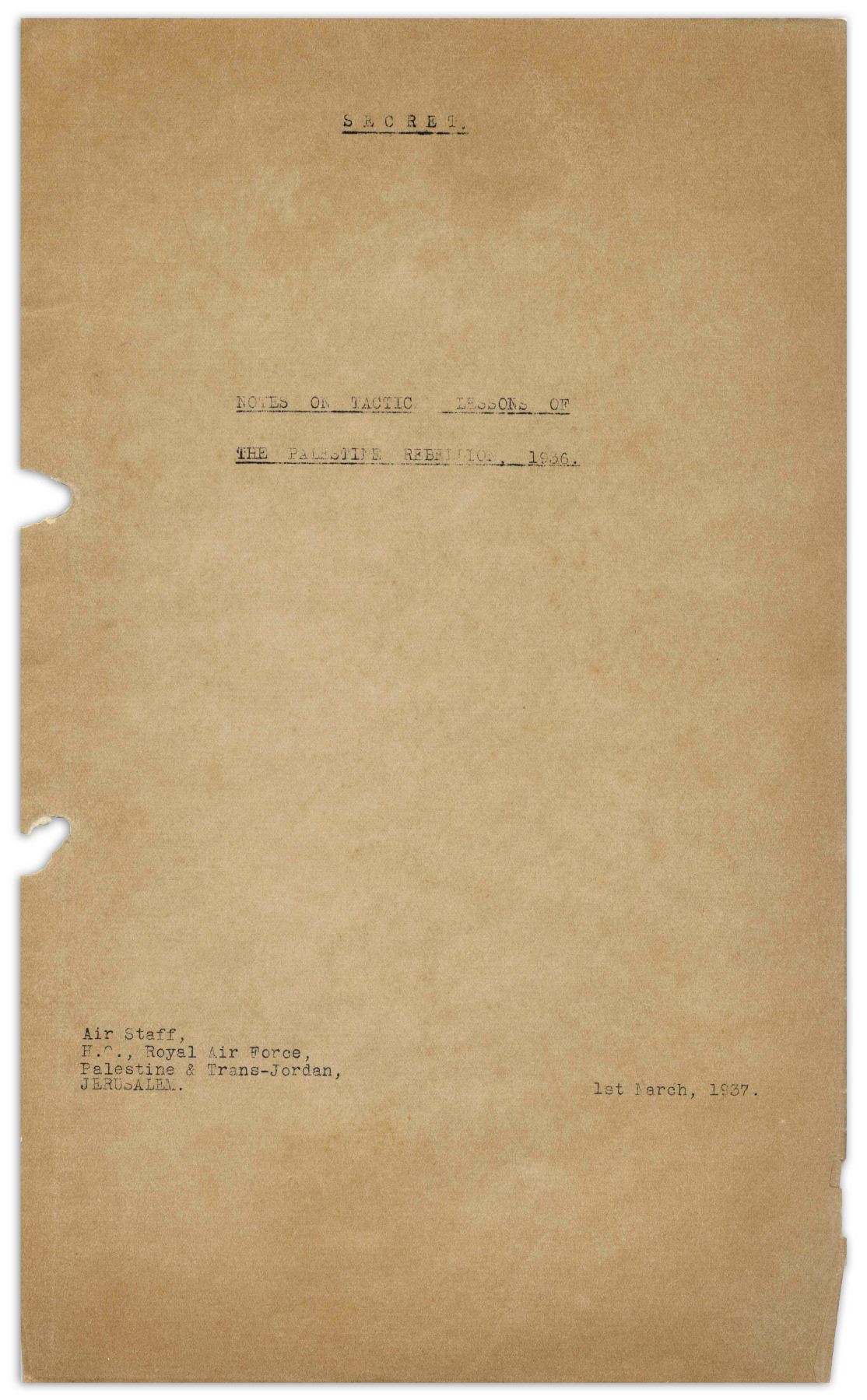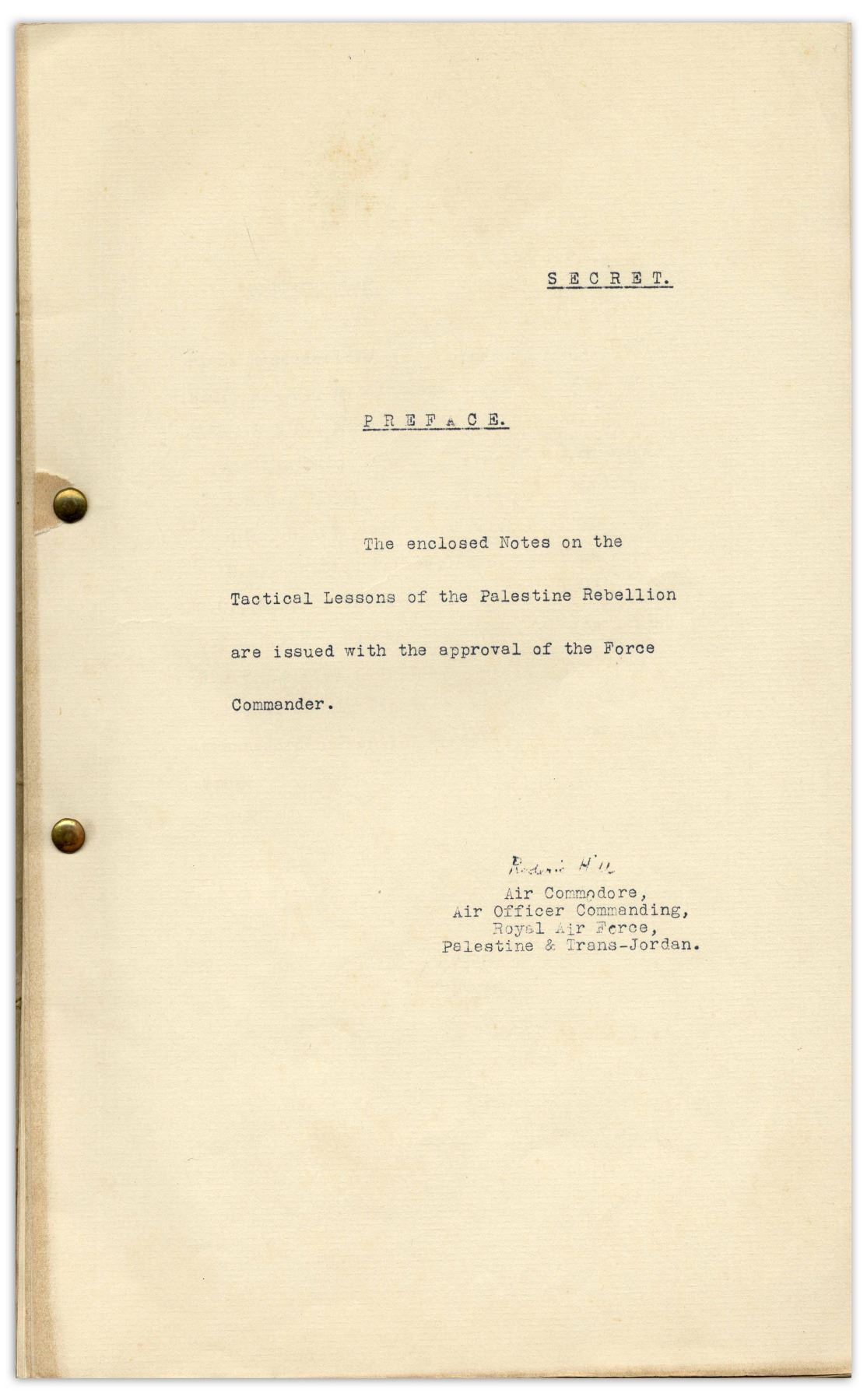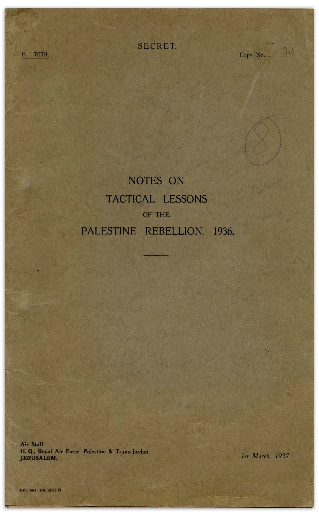 Intriguing publication published by the British Air Force, entitled ''Notes on Tactical Lessons of the Palestine Rebellion, 1936''. Jerusalem: Air Staff, H.Q., Royal Air Force, Palestine & Trans-Jordan, March, 1937. Booklet, marked ''SECRET'', was published in response to the 1936 Arab Revolt, which lasted until 1939 (named ''The Great Arab Revolt'') in part because of the perceived response by the British government to the early insurgency, outlined here. 18pp. booklet gives tactical directives to British pilots in response to the insurgency, described as ''armed bands and saboteurs in hill country and rural districts, directed against the civil organization, armed forces, Jewish interests and road, rail and telegraph communications.'' Air tactics are presented including how to locate and hit the enemy with machine gun and bomb attacks. The last section of the booklet outlines various attacks by Arab groups in Palestine during the summer of 1936. Measures 8.25'' x 13''. First page detached from two brads binding the document. Light toning and wear with pencil mark to cover. Very good condition.