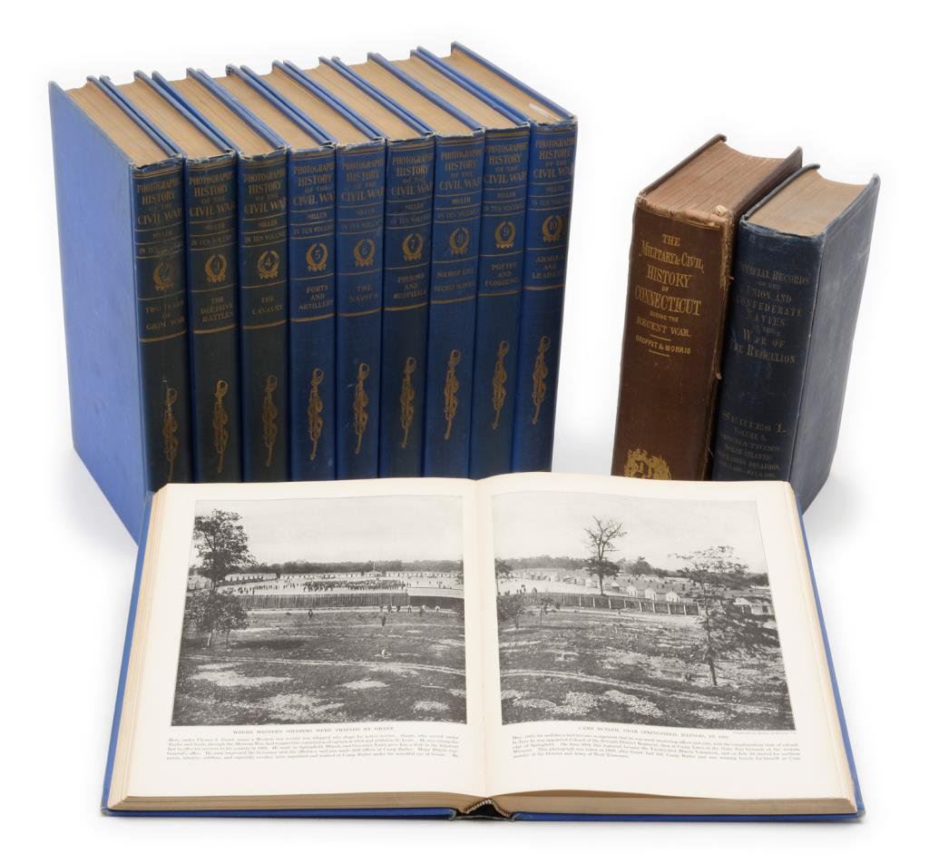 Book lot including a 10 volume set of hardbacks “Photographic History of the Civil War plus an 1868-dated hardback entitled “The Military & Civil History of Connecticut During the Recent War” by Croffut & Morris; also one volume (Series I, Volume 8) of the “Official Recordes of the Union and Confederate Navies in the War of the Rebellion”; hardback and dated 1899, printed by the Washington Government Printing Office. Great reference materials on the American Civil War. Est.: $200-$400.