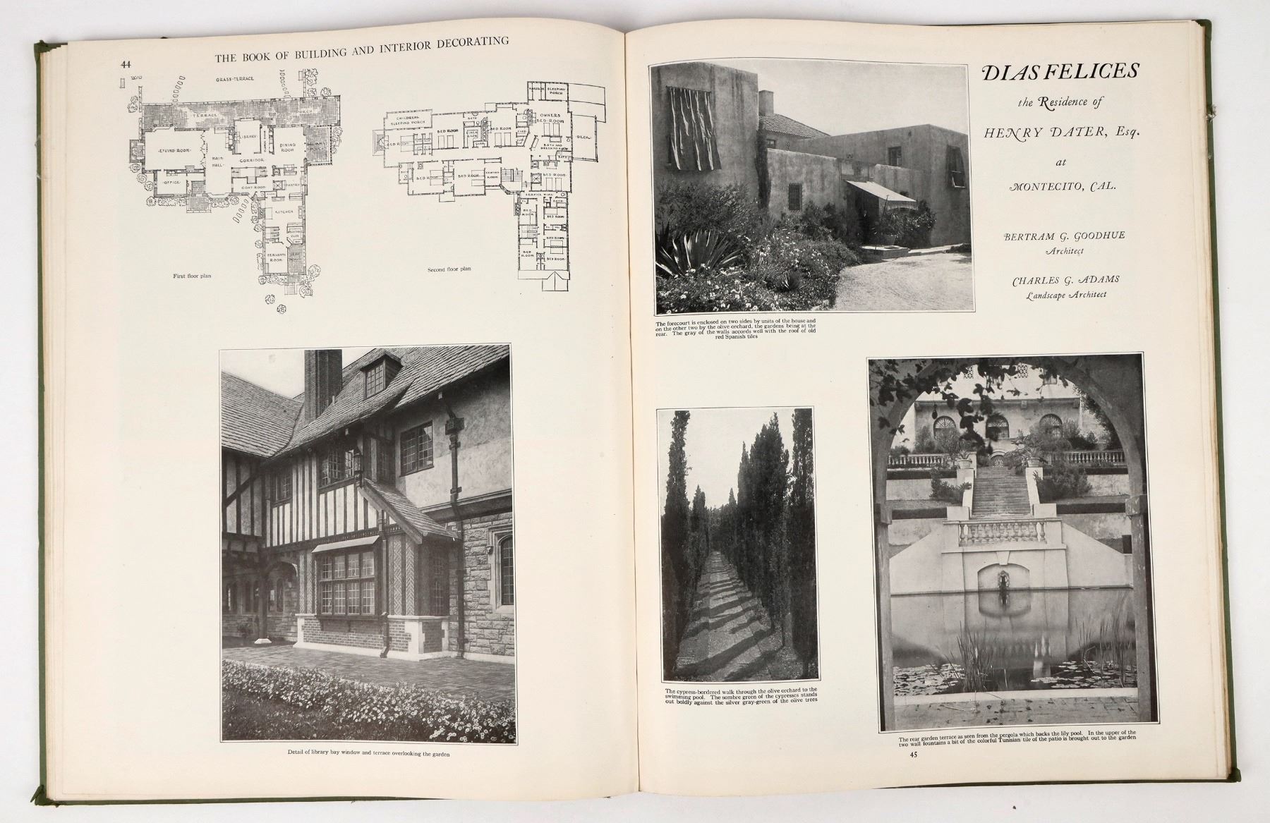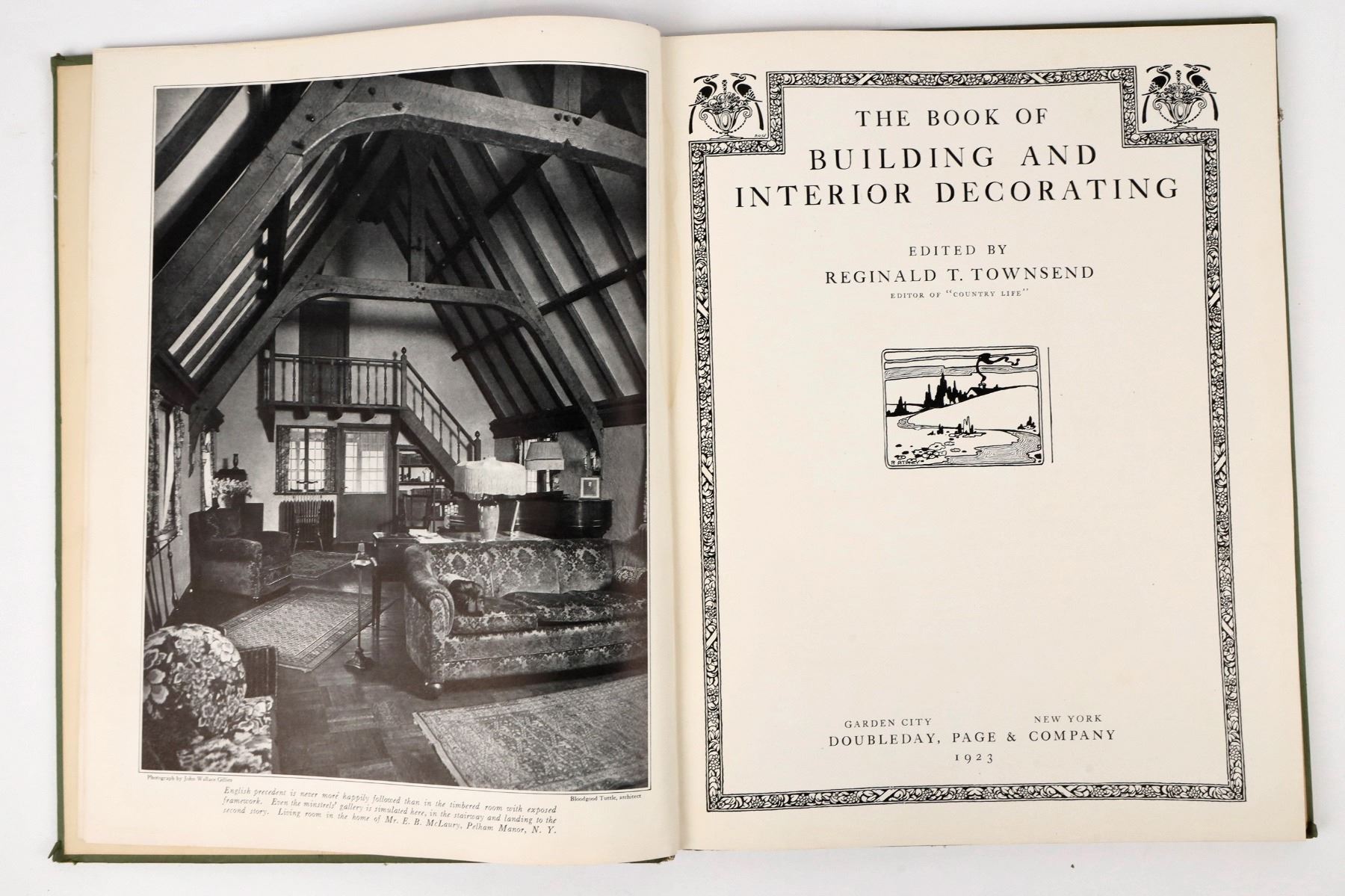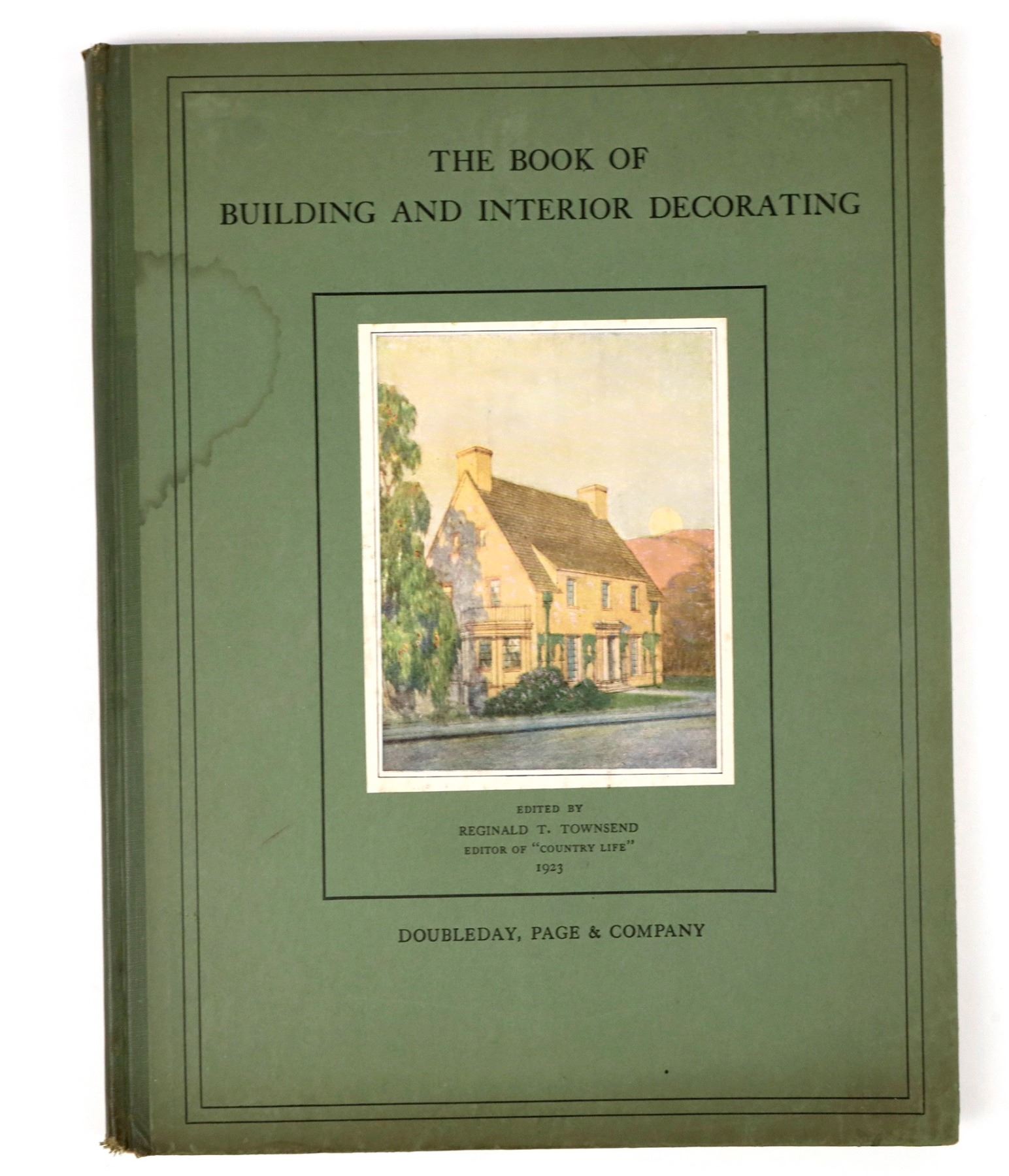 This book is titled :"The Book of Building and Interior Designs" edited by Reginald Townsend is hardcover at pp. 104. Well illustrated and photographed, this book shows construction techniques that would still apply today even though this book was written in 1923. If you think that it would be irrelevant today, think about the style of house you would build on Chesapeake Bay, RI; Santa Fe, NM; Miami, Fl.; or San Diego, Ca. There is even a chapter on furniture restoration. On a sound binding, lightly foxed corners, one minor water spot on the cover. Good reading and reference. Green cover not DJ. Please see photo for details.