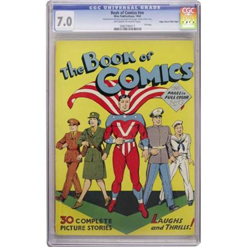<B>Book of Comics #nn Mile High pedigree (Wise Publications, 1944) CGC FN/VF 7.0 Off-white to white pages.</B></I> This issue doesn't turn up that often, as evidenced by CGC's having certified just two copies to date. Our offering is by far the highest-graded. It has that Mile High look, but CGC notes, "Manufactured with piece out margin of 53rd page, slightly affects story." Overstreet 2007 FN 6.0 value = $120; VF 8.0 value = $241. CGC census 5/07: 1 in 7.0, none higher.<BR><BR><b>Shipping:</b> Comics - Slabbed (certified) (<a target="_blank" href="http://www.heritageauctions.com/common/shipping.php">view shipping information</a>)