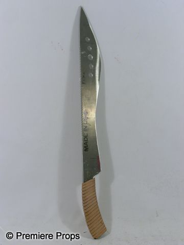 Eli's (Denzel Washington) silver with five circular holes in the middle of the blade, rough edge on the outside and smooth edge on the inside, sword. One side of the blade is marked "Made in USA" and the other side is blank. This sword is made of metal and has a brown leather handle with foam underneath for cushion, handle. (approx. 26" long) (Possible prototype or for training.)