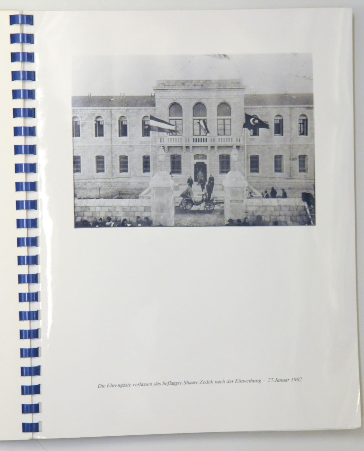 Book on the Shaare Zedek Medical Center in Jerusalem, published independently by the hospital, in German, contains texts by Max Whitman and photos edited by Israel Naveh (on high-quality photo paper), a total of 43 numbered text pages and additional pages with photos. In good condition: pages slightly yellow. Dimensions: 28X23 cm.