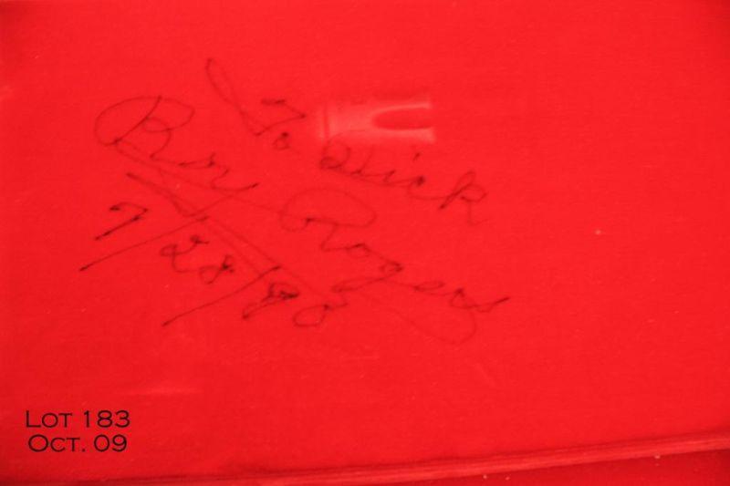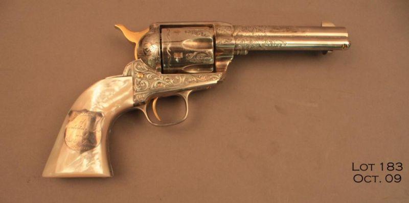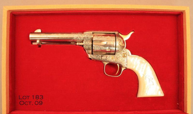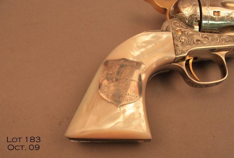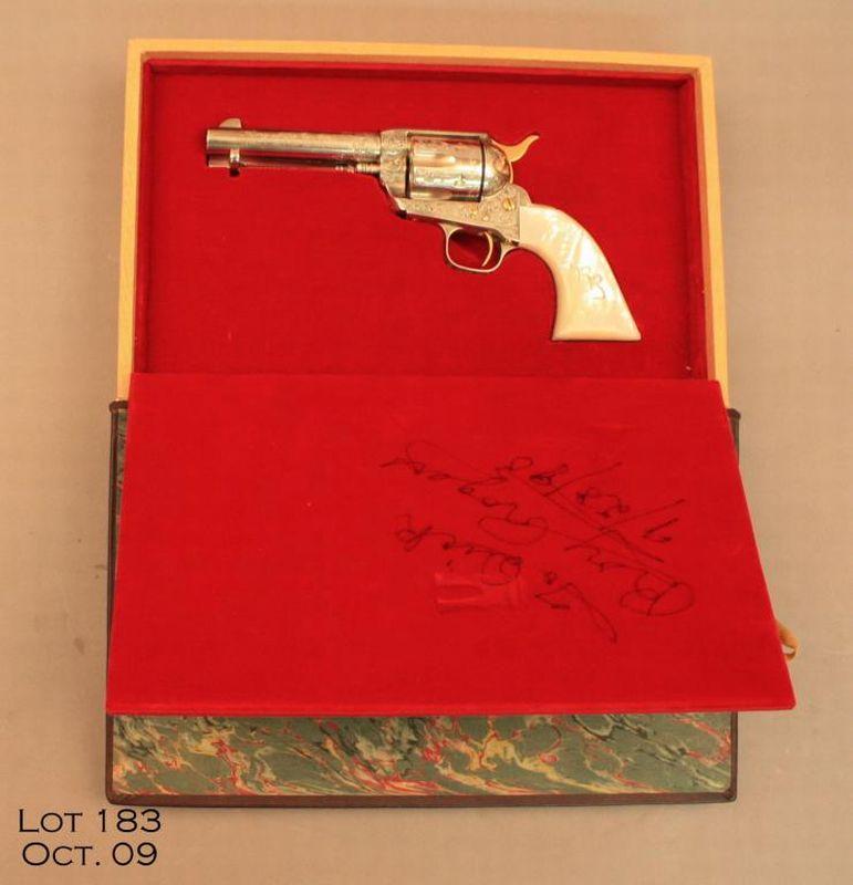 Book-style cased, engraved and ornamented U.S. Historical Society Single Action revolver presented at the Golden Boot awards personally by Roy Rogers to our consignor, .45 cal., 4-3/4” barrel, nickel finish, pearl grips, # 4-RR. Thisdeluxe gun is in overall excellent condition showing little handling, cylinder shows a drag line; engraving is tasteful and includes an inscription on the left side of the barrel “King of the Cowboys Single Action Army .45”; barreladdress is “U.S. Historical Society Richmond, VA, USA”. Roy’s signature is also engraved on the right side of the barrel and there is a plaque on the right grip that states “50 years of Entertainment and Public Service 1940-1990”. Thegun is cased as noted above, and the interior of the lid is personally signed by Roy Rogers and there is a photo of our consignor with Roy holding this gun and case and the photo is also signed by the King of the Cowboys. Great provenance.$2,000-$4,000.