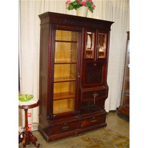 A very unusual walnut double section bookcase-desk combination in all original condition. It has double doors with beveled mirrors above the drop front desk.